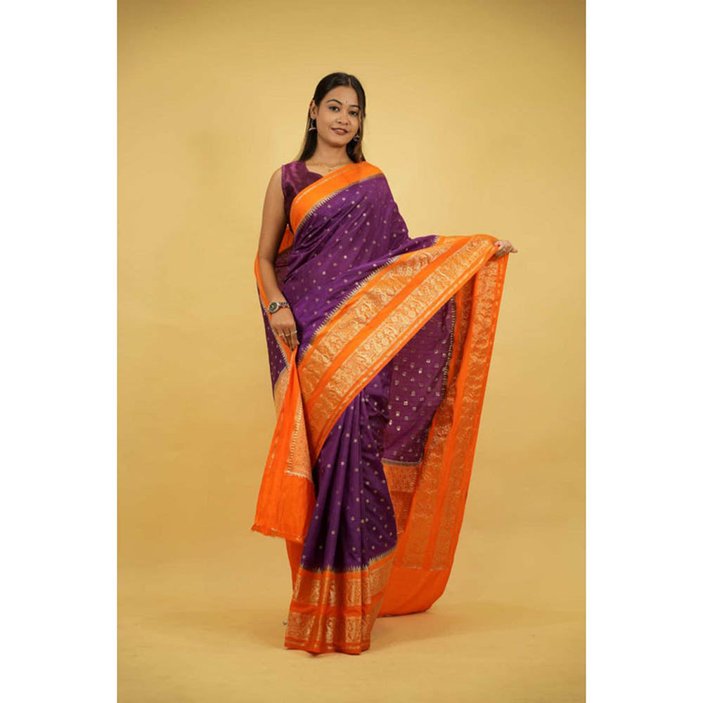 Womens Woven Zari Purple Pre-Draped Saree With Unstitched Blouse