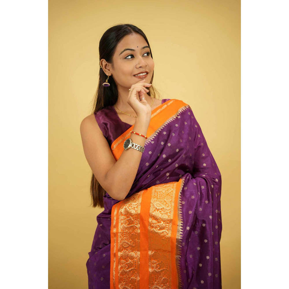 Isadora Life Womens Woven Zari Purple Pre-Draped Saree With Unstitched Blouse