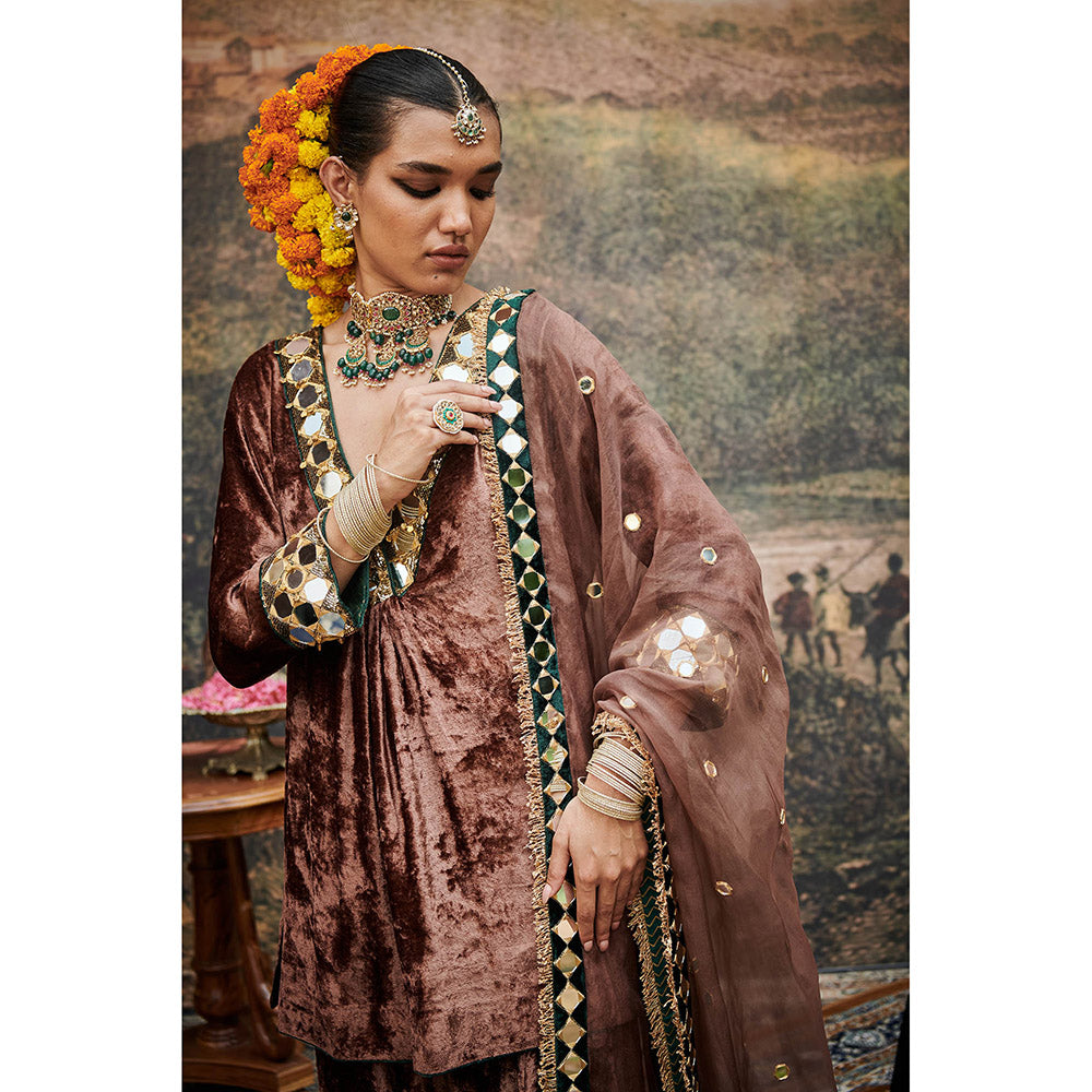 Brown Makhmal Khayal Kurti with Sharara and Dupatta (Set of 3)