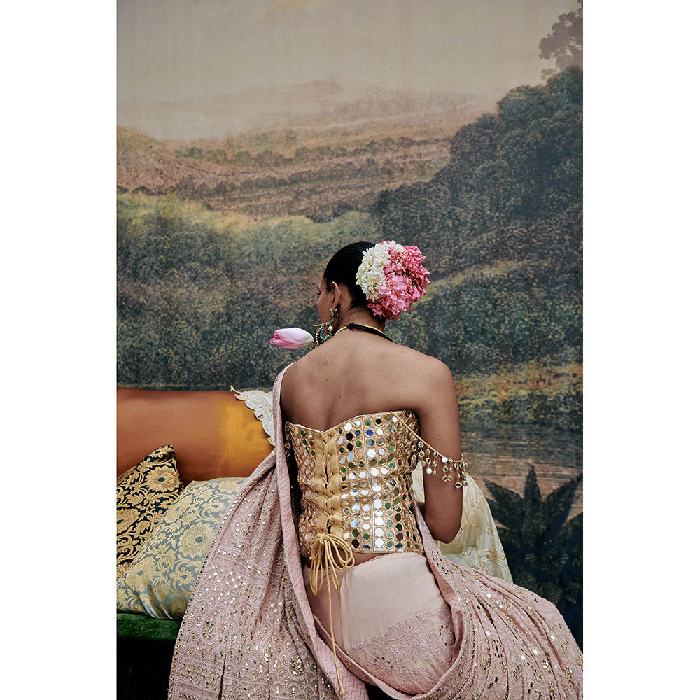 Description : Pink Lucknowi Saree, Adorned with Intricate Hand-Embroidery and Long Mirror Tassels Attached To Border and Pallu Is Paired with A Stunning Mirror Work Corset Blouse On Gota Lined with Chanderi Silk.