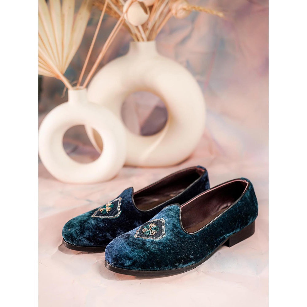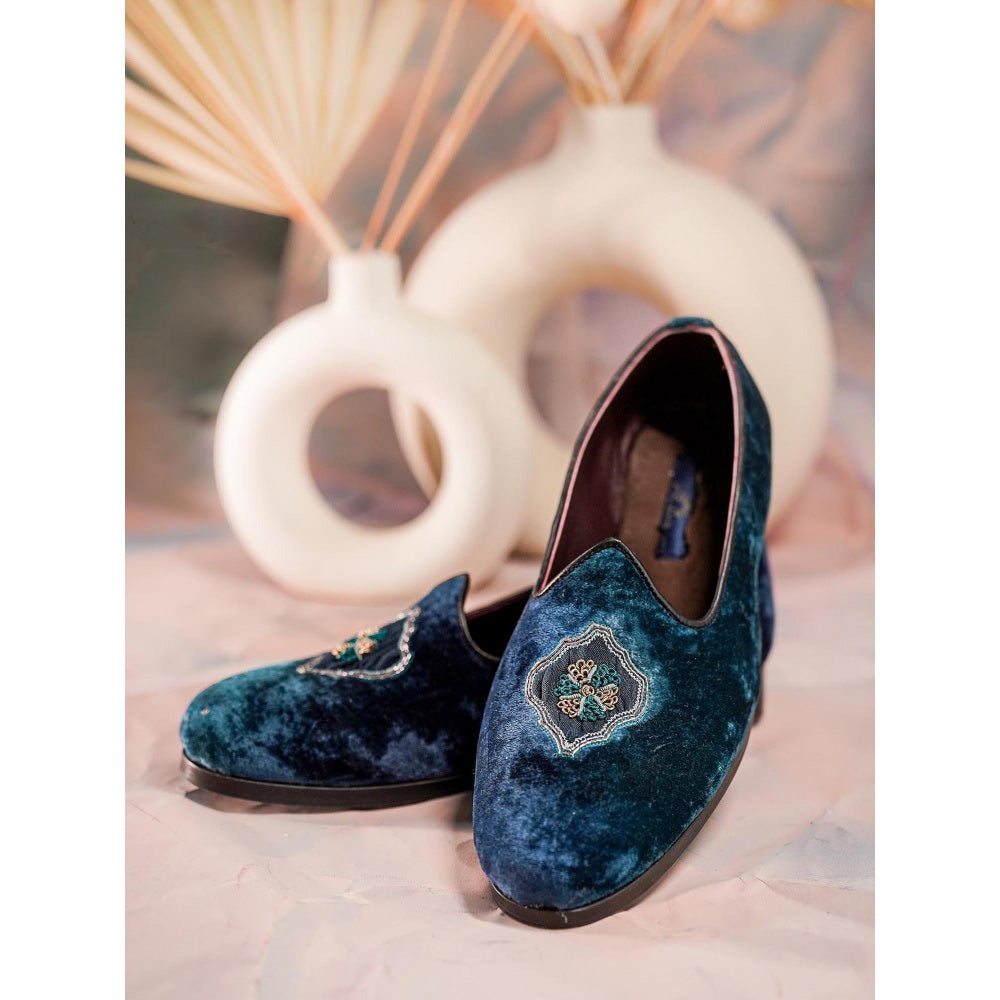 Description : Featuring teal hand embroidered juti with leather sole and rubber forepart.