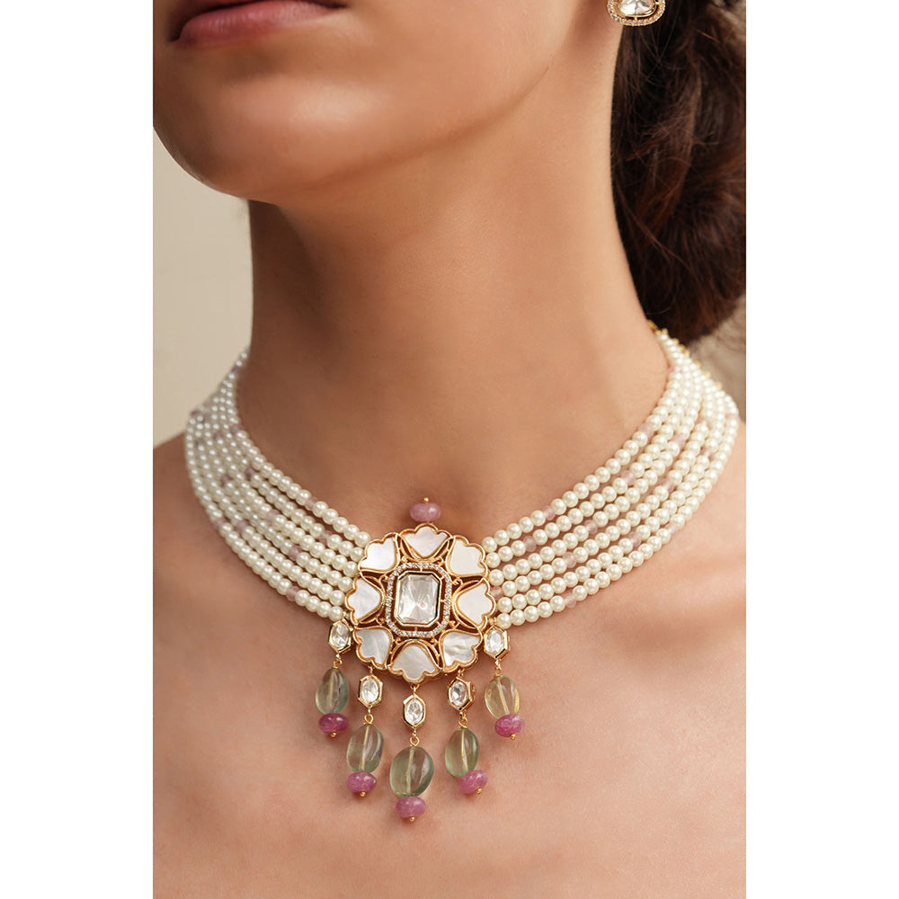 Description : A Graceful Fusion Of White Beads, This Set Features A Stunning Polki Center Pendant with Green and Pink Hanging Accents, Offering A Soft Yet Striking Vibe.