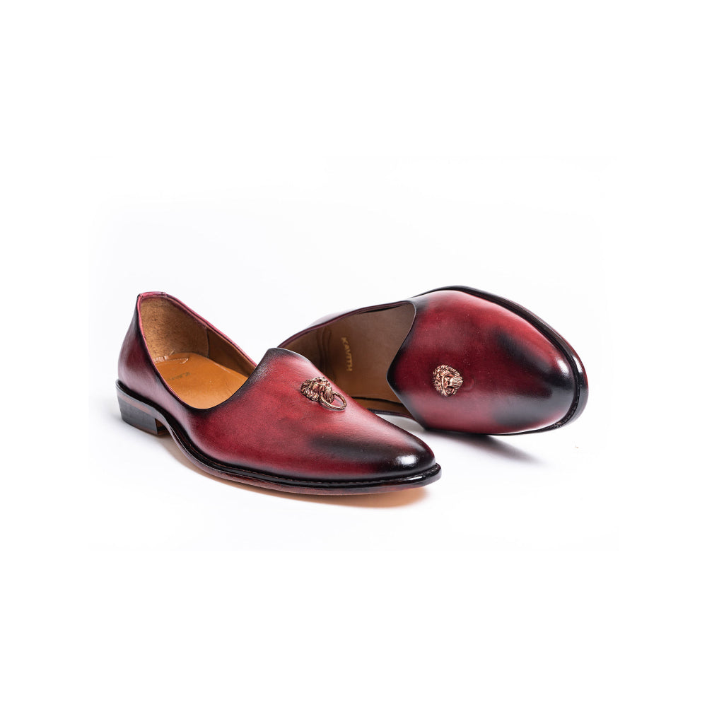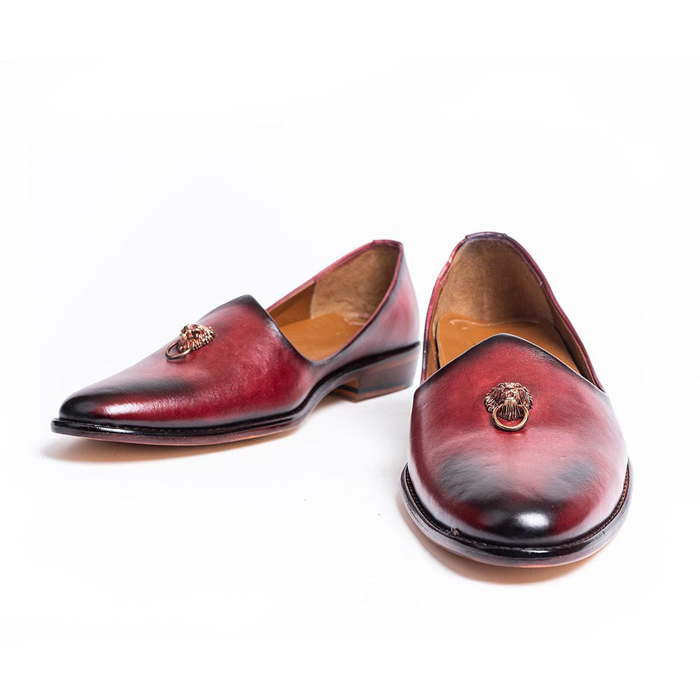 Description : The epitome of comfort and cutting-edge design, this Kavith Bordeaux Patina Ornament Jutti is handpainted with patina art for an antique effect and completed with a lion head ornament. Made using Nappa leather lining, this jutti is finished with a horseshoe-style tapered heel and an Argentinian sole. Create a stunning style statement as you wear this pair to the next event!