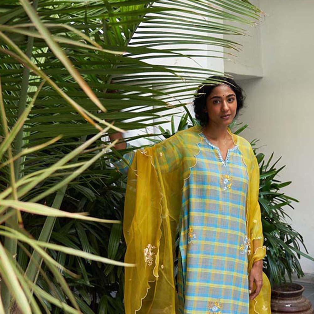 Label Earthen Neela Sitara Phool Checked Embroidered Kurta Pant with Dupatta (Set of 3)