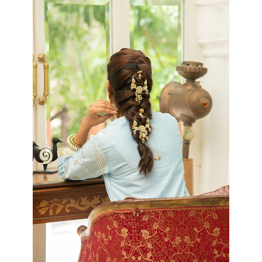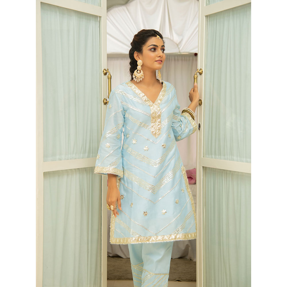 Description : Set of 3 consists of kurta, pant and inner. Noor, bringing the magic of festivities straight to your closet in shades of pastels. KURTI: A elegant powder blue short chanderi kurti with heavy gota lace detailing on the neckline, sleeves & hemline. Comes with an inner. PANTS: Straight fit cotton silk pants adorned with gota detailing.