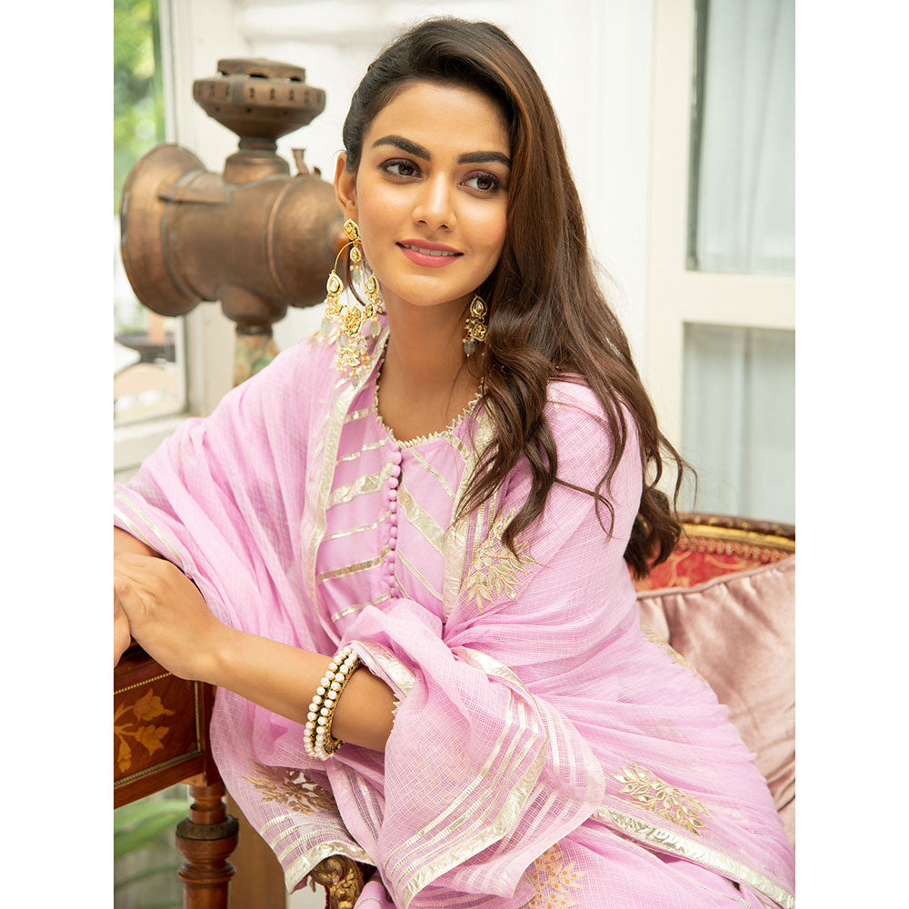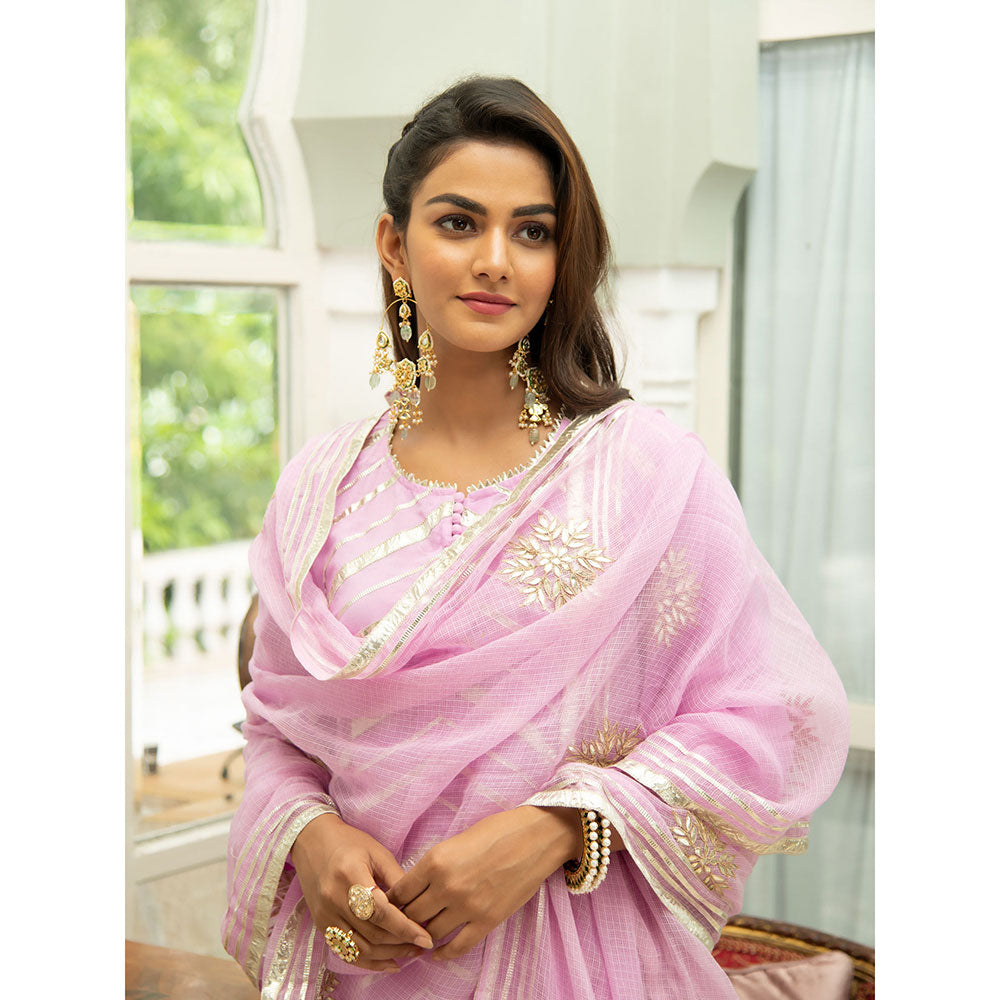 Description : Set of 3 consists of kurta, palazzo and dupatta. Noor, bringing the magic of festivities straight to your closet in shades of pastels. Delicately adorned with lehirya gota detailing. KURTI: A delicated baby pink kurti with lehriya gota detailing on the neckline, sleeves & hemline. Adorned with potli buttons. DUPATTA: An elegant sheer kota doria dupatta, complete with handwork gota motifs. PANTS: Straight fit cotton pants enhanced with gota work.