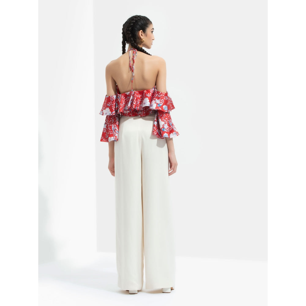 Ajisia Printed Cold Shoulder Crop Top Paired with Ivory Trouser Red (Set of 2)