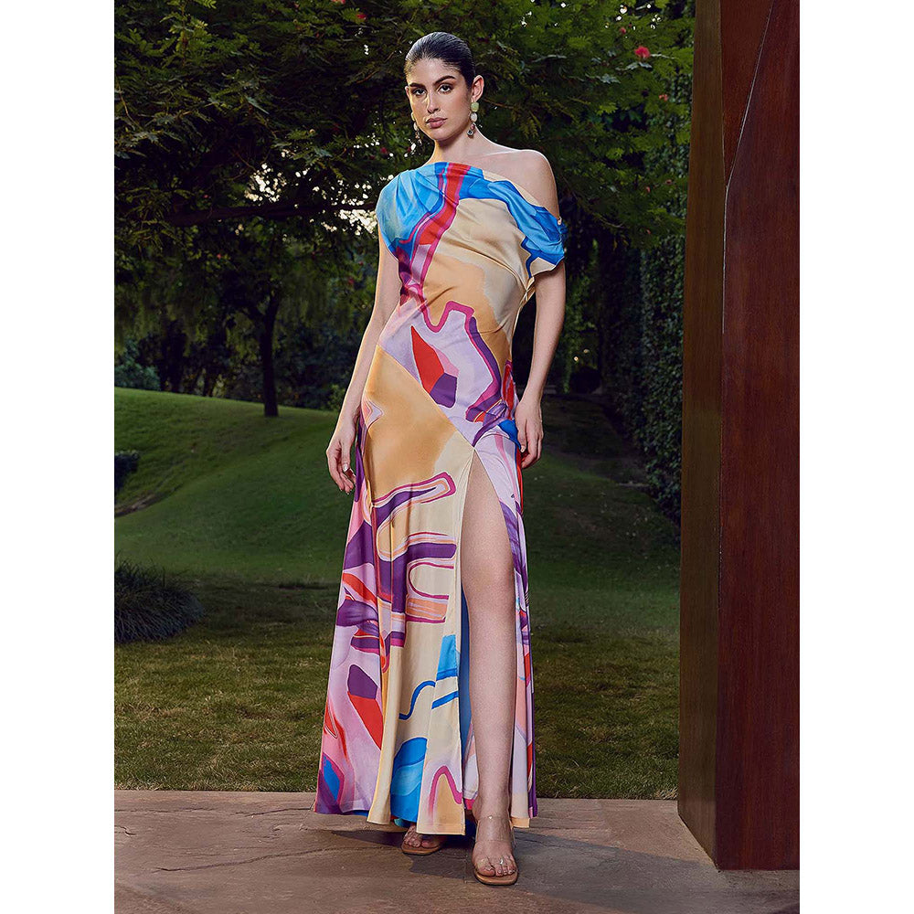 MANDIRA WIRK Blue Modern Abstract One Shoulder Dress