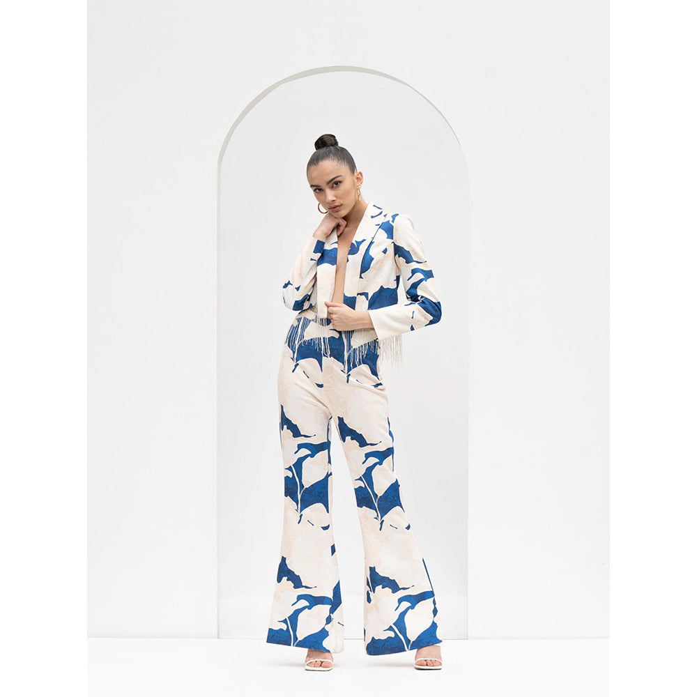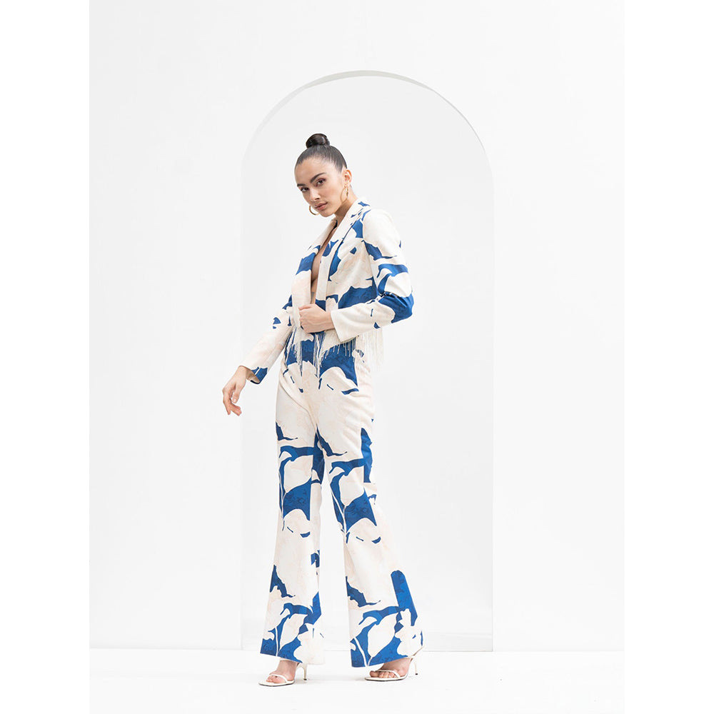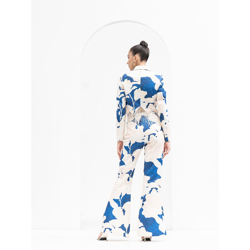 Description : Foma mystic beige texture printed jacket set with dazzling hand embroidery tassels along the hemline. It is designed with full sleeves and a shawl lapel.
