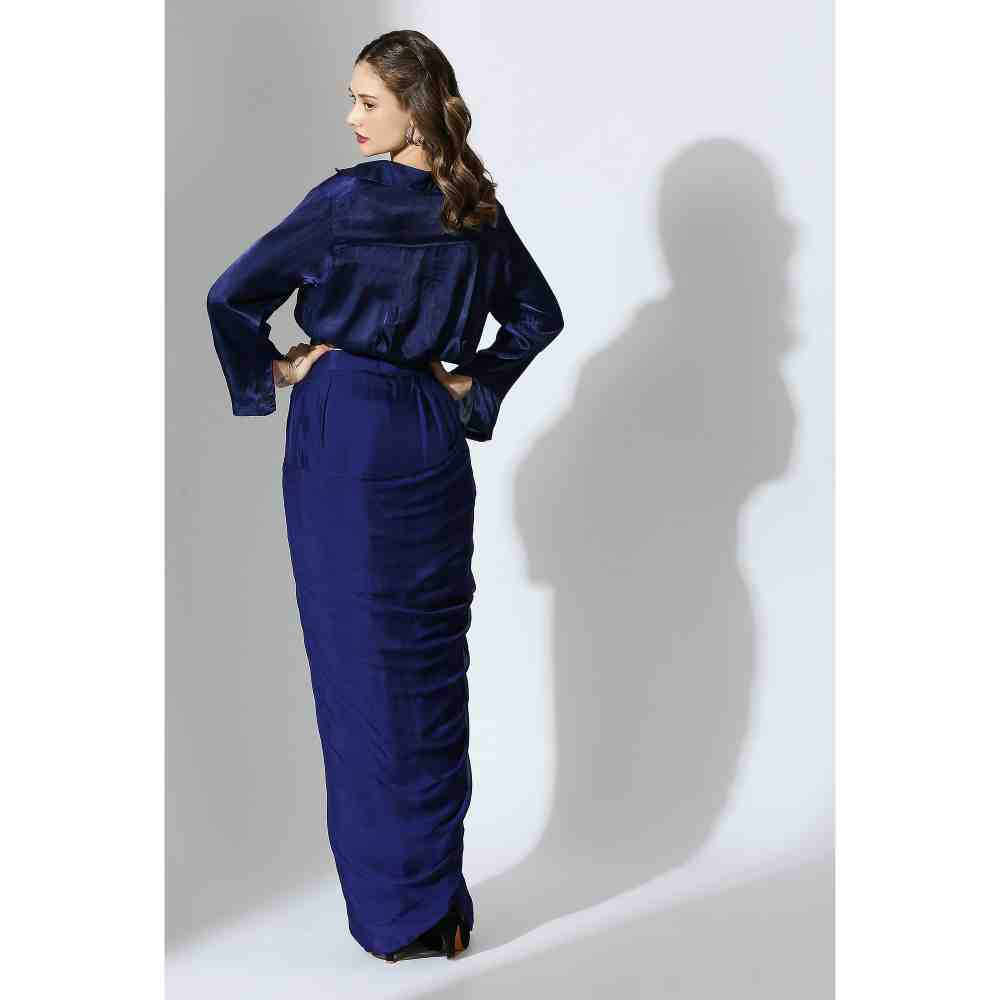 Royal Blue Embellished Draped Shirt with Skirt (Set of 2)