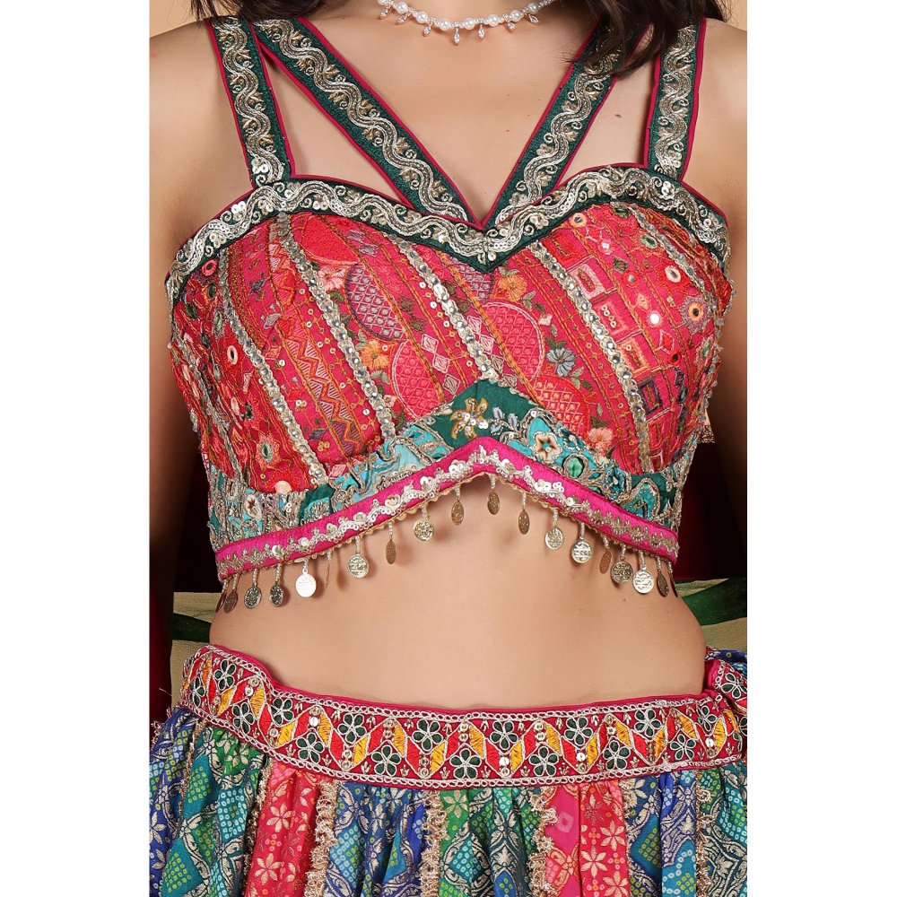 Description : Multicolour Zari Embroidered Strappy Blouse , Multicolour Georgette Brocade Full Flair Lehenga With Bright Green Georgette Dupatta .