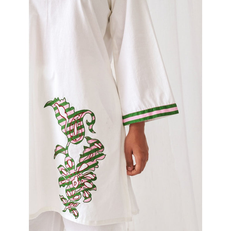 Description : This White Co-Ord Set Features Vibrant Pink And Green Patchwork Embroidery Running From The Bottom To Mid-Waist, With Matching Accents On The Bell Sleeves. The Kurta Boasts A Keyhole Neckline And A Relaxed Silhouette. Paired With Relaxed Palazzo With A Rounded Hemline And Green Hand-Stitched Embroidery For A Fun, Fresh Look.