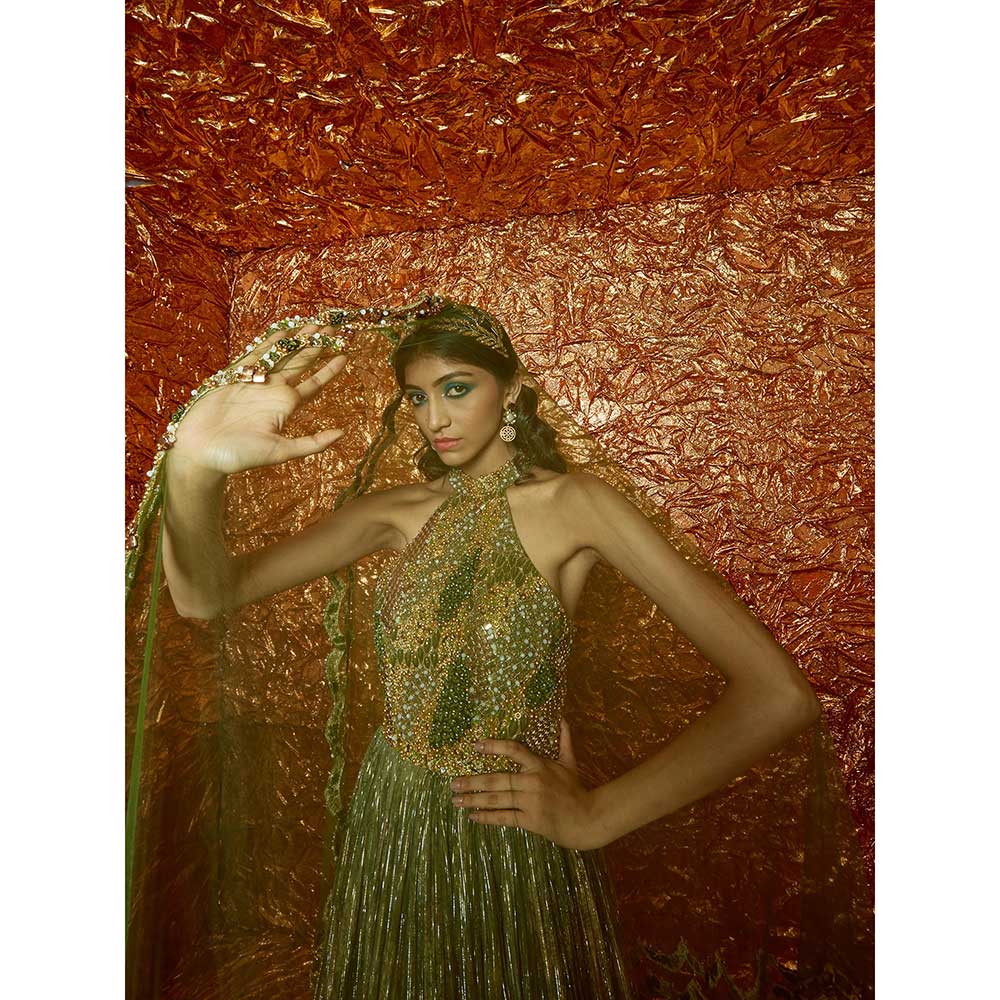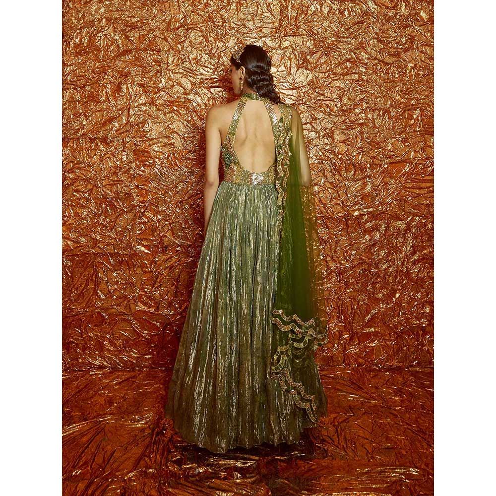 Description : Green Printed Lurex Anarkali with Hand-Embroidered Yoke and Dupatta