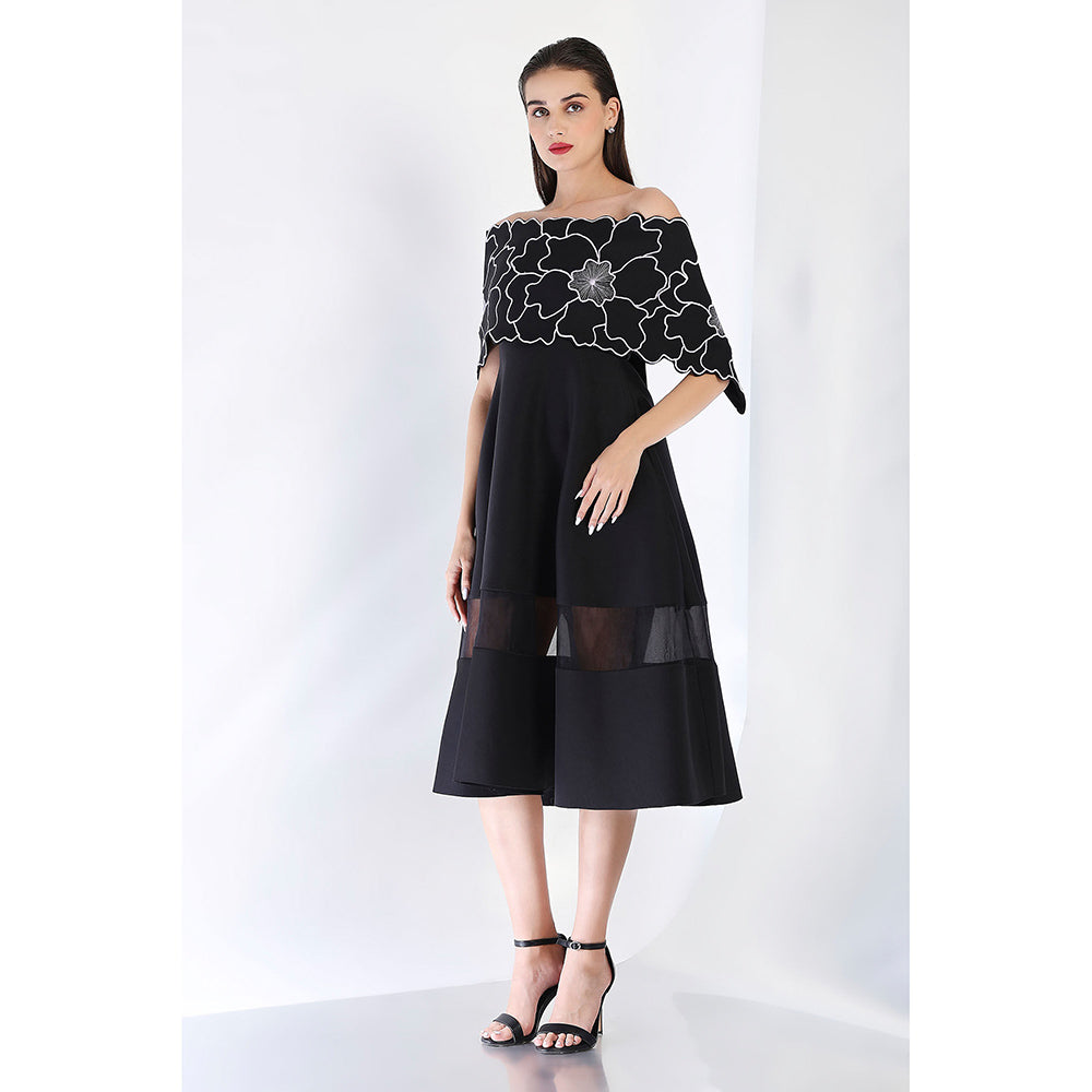 Black Fit and Flare Embroidered Dress and Wrap