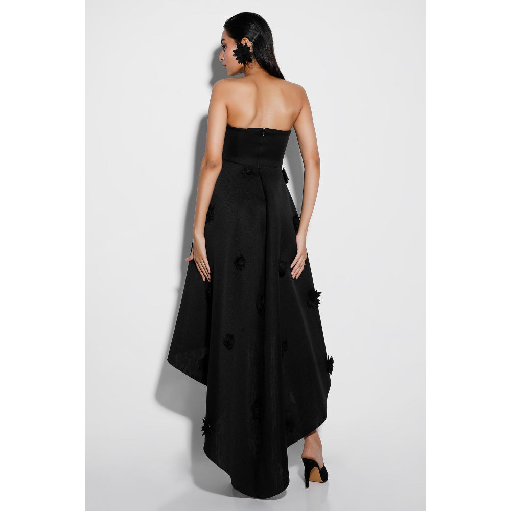 Description : Make A Bold Statement In Our Black Tube Dress Featuring A Stunning High-Low Hem. Adorned With Exquisite 3D Appliqu Floral Pieces Throughout, This Dress Combines Modern Design With Artistic Flair, Perfect For Any Occasion That Demands Attention.