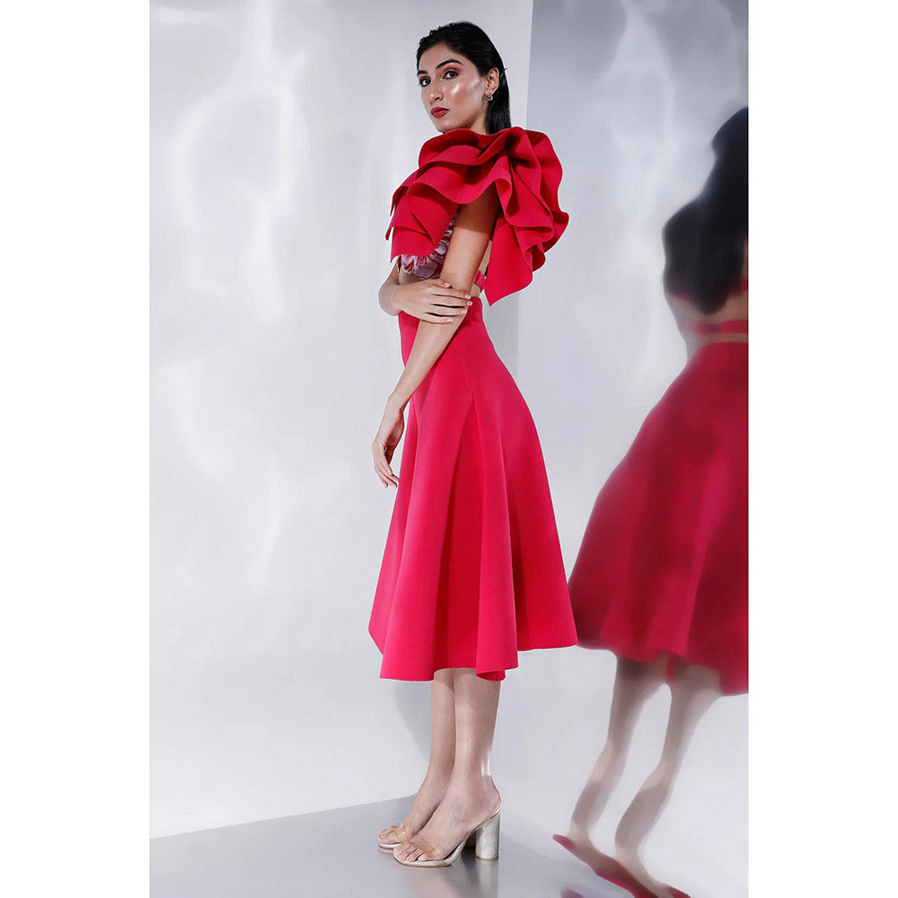 Description : Make A Bold Statement In This Stunning Red Set, Featuring A Hand-Embroidered Crop Top Embellished With Sequins And Beads. The Structured Skirt Is Elegantly Complemented By Detachable Ruffles That Add A Dramatic Flair, Perfect For Twirling On The Dance Floor. With An Adjustable Back Fastening On The Crop, This Ensemble Ensures A Comfortable And Flattering Fit, Making It Ideal For Special Occasions.
