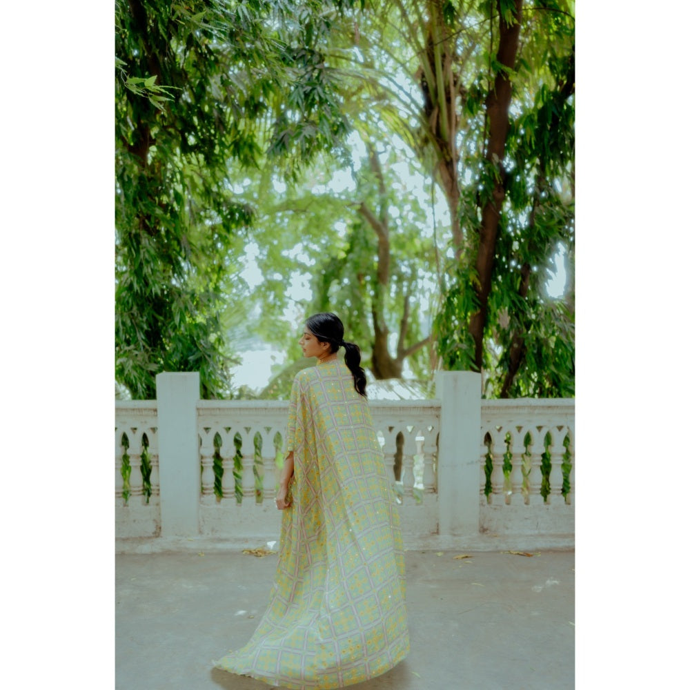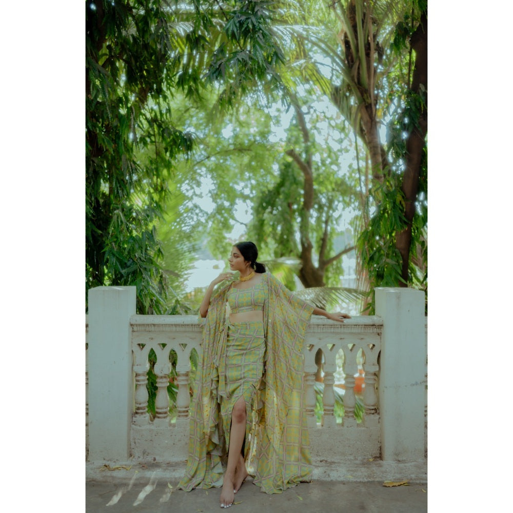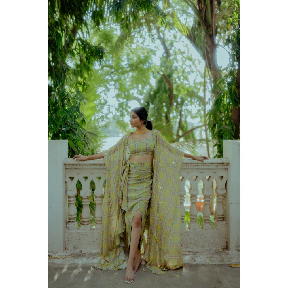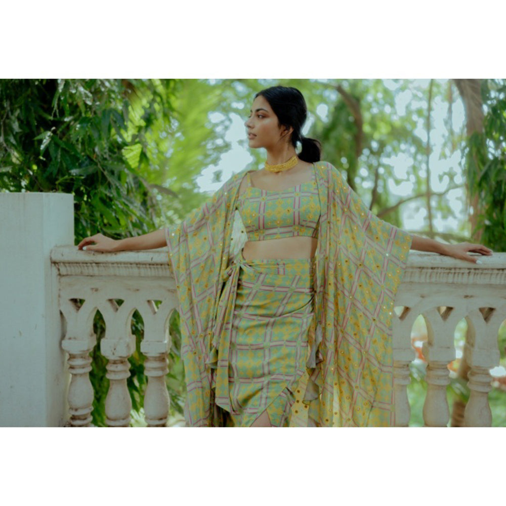 Description : our geometric print set consists of a drama jacket and crop top hand embroidered with mirror and thread along with wrap around skirt