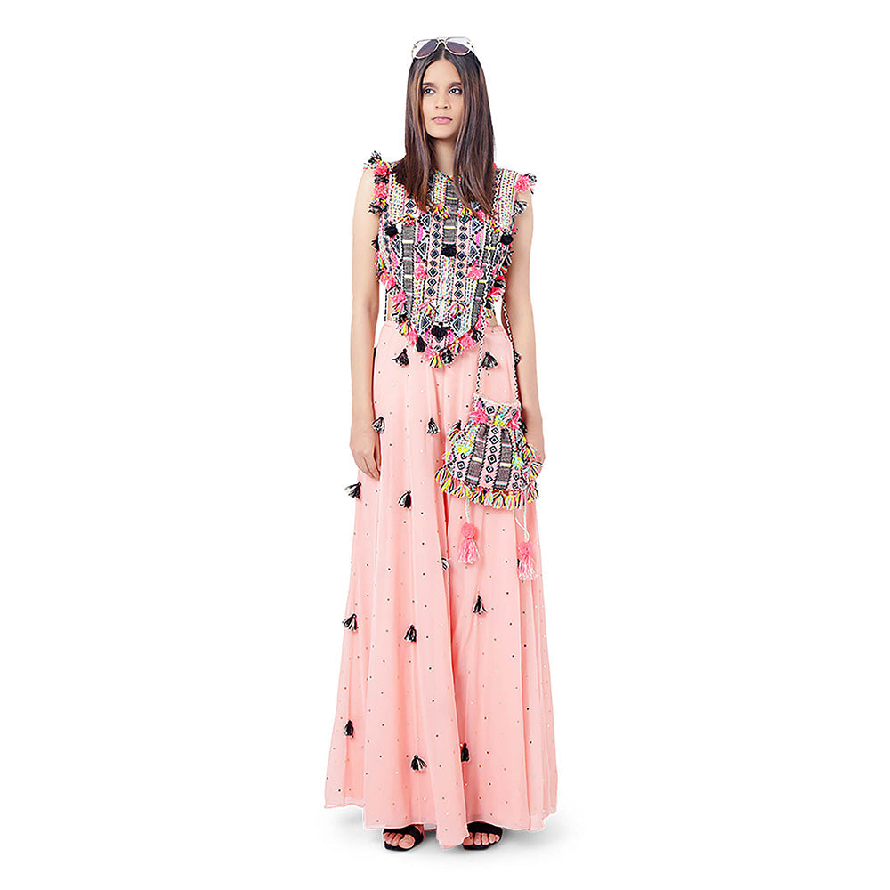 Description : Coral Colour Georgette Embroidered Choli with Mukesh Georgette Sharara with Tassel Detailing