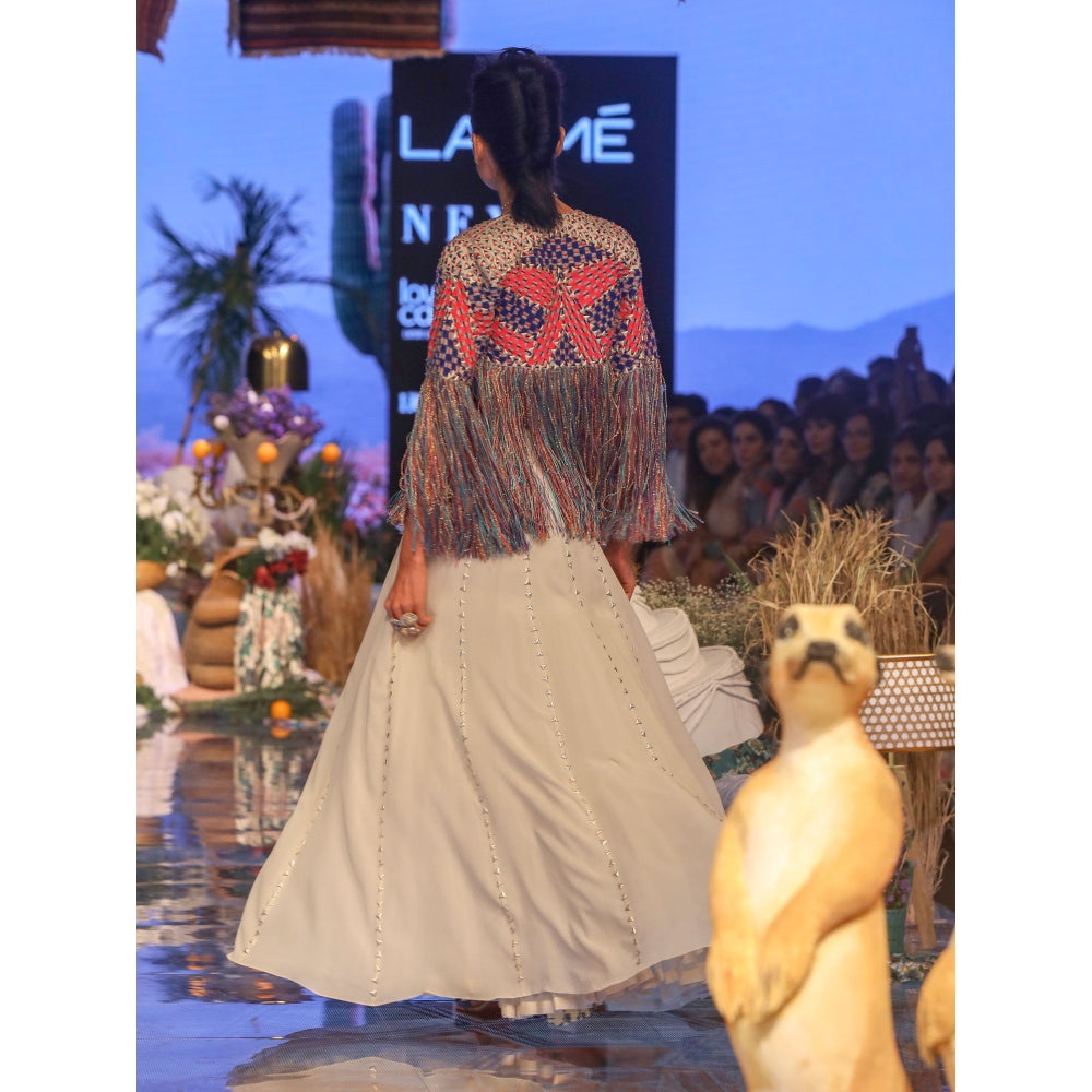 Description : Make all heads turn with this mult-colour jacket by Payal Singhal. Crafted in georgette, it features beautiful embroidery with fringe details. This comes with a chalk-white georgette bustier and embroidered lehenga to complete the regal look. Style it with statement jewellery and embellished footwear to ace the outfit.