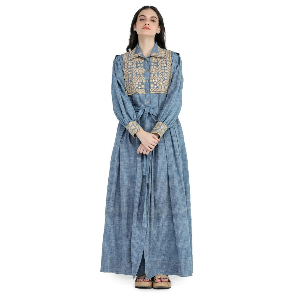 Blue Khadi Embroidered Shirt Maxi Dress with Sash Belt (Set of 2)