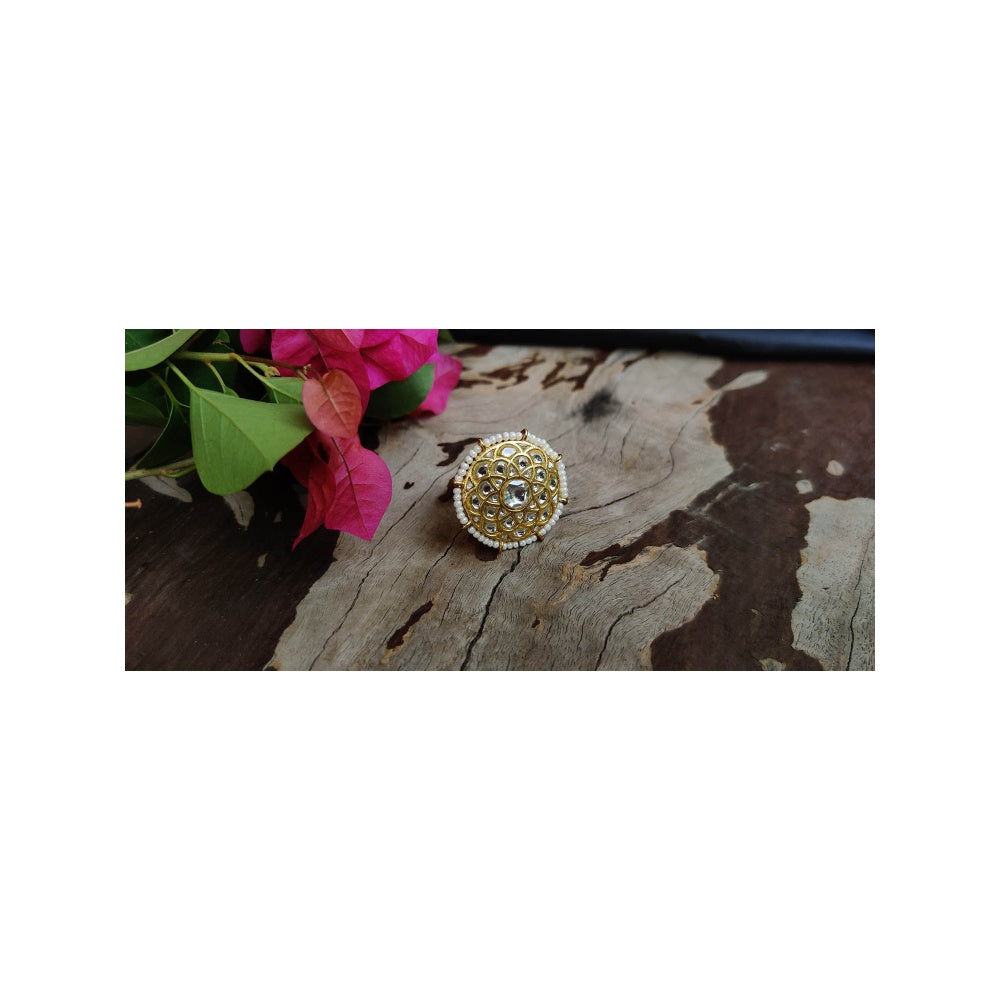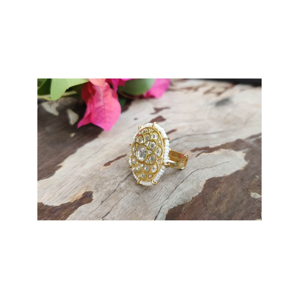 RIANA JEWELLERY Round Shaped Ring Studded White Jadtar Stone In Moti Work