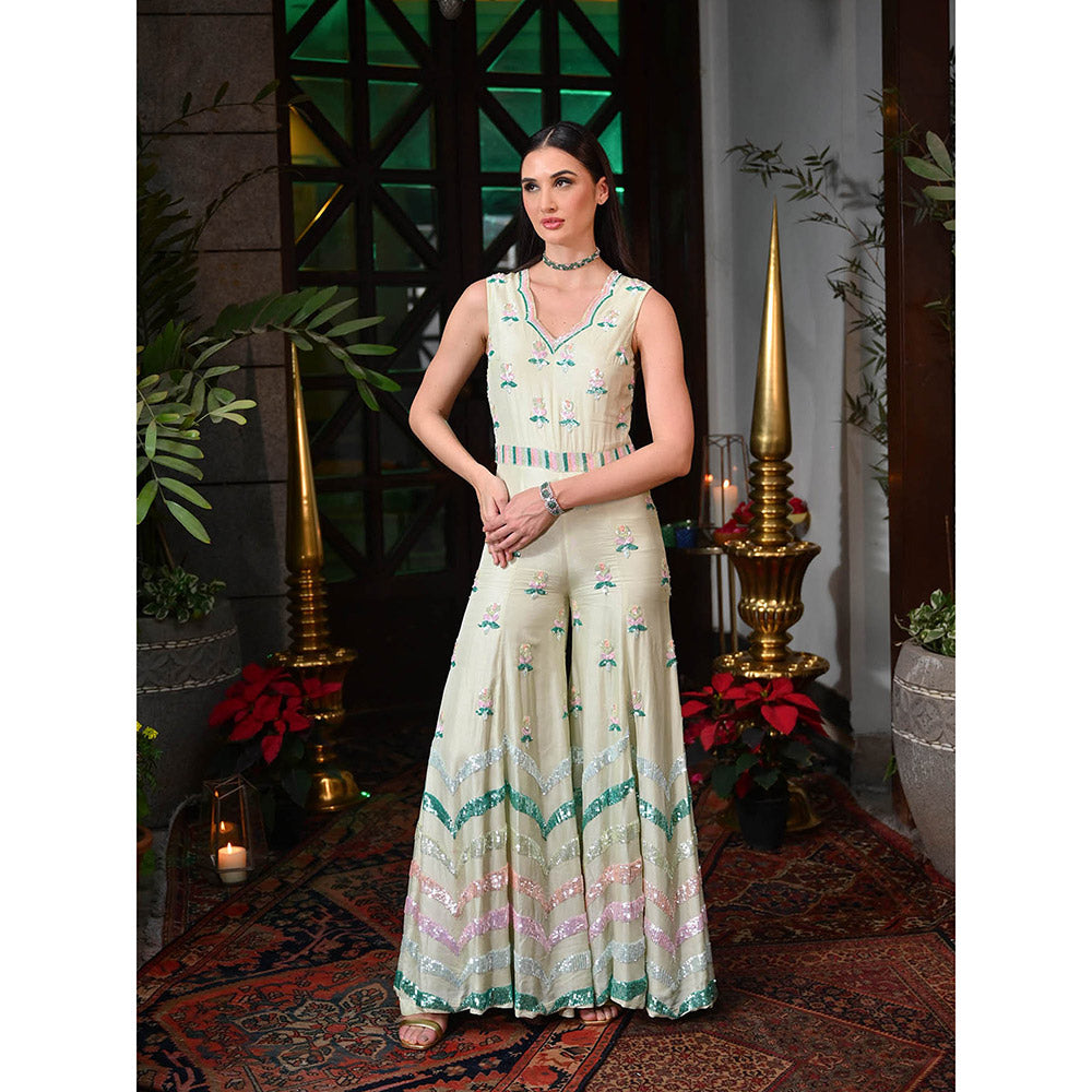 Description : Add a touch of elegance to your wardrobe with this green jumpsuit by Rococo. Made from high-quality blended fabric, it features sleeveless, v-neck style with embellished/sequined pattern, finished with a flared style. Style it with an elegant watch and heels to complete the ensemble.