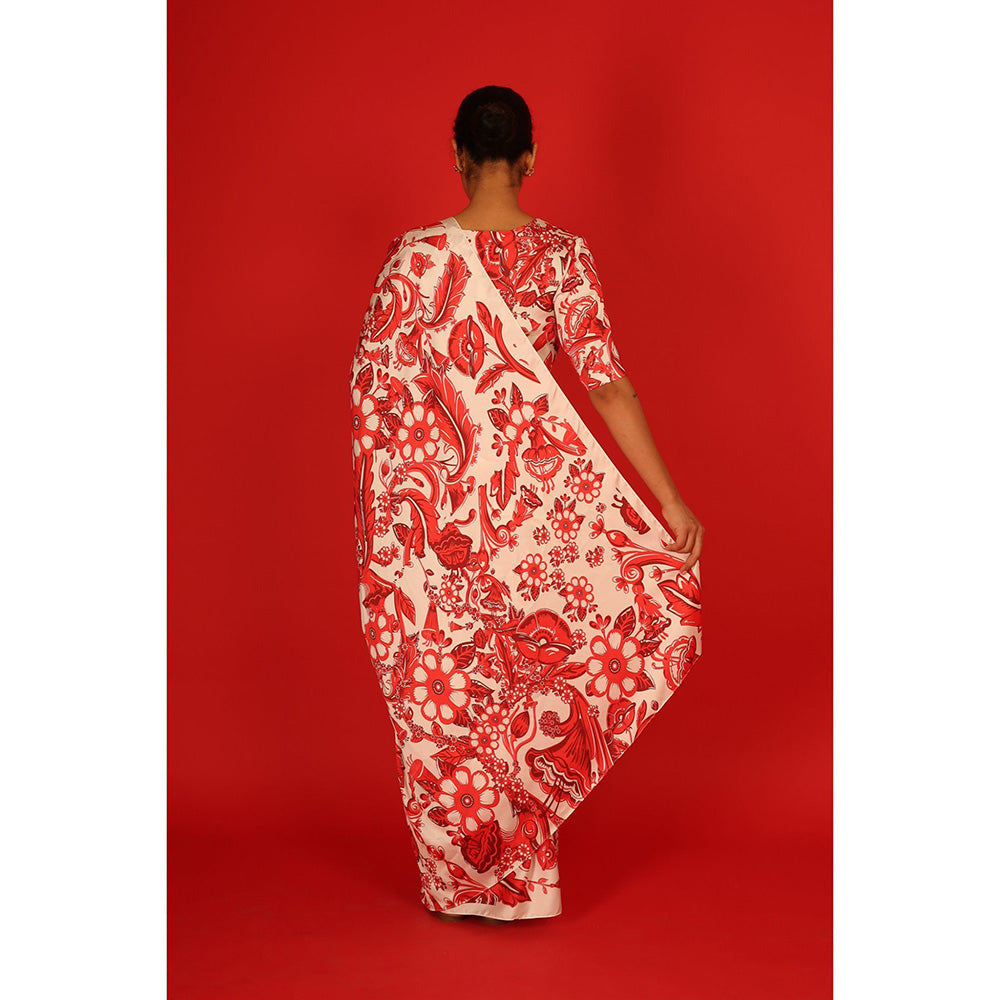 Saksham & Neharicka Red & Ivory Printed Saree with Unstitched Blouse