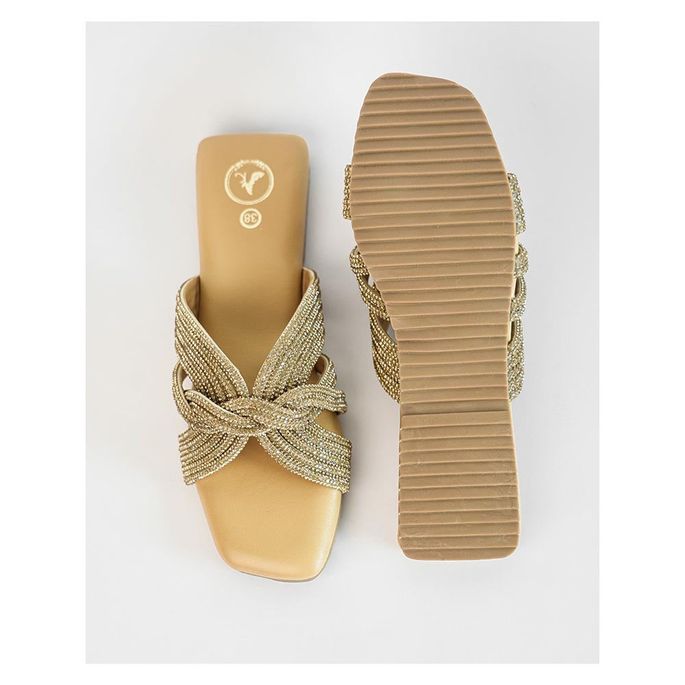 Description : The Nude Open Toe Slip-On Twister Flats Feature Elegant Golden Twister Straps Adorned with Sparkling Rhinestone Embellishments. Designed for Comfort, They Come with A Memory Cushion and A Vegan Sole, Making Them Perfect for All Occasions-Whether It's A Wedding, Party, or Casual Outing. These Versatile Flats Blend Style and Comfort Effortlessly, Making Them A Must-Have Addition To Your Wardrobe.