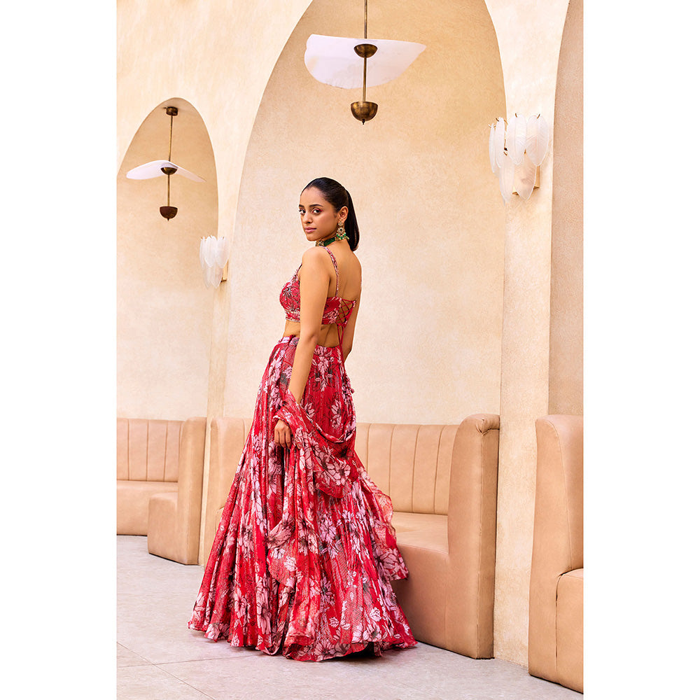 SANYA GULATI Pink Floral Print Stitched Blouse & Lehenga with Dupatta (Set of 3)