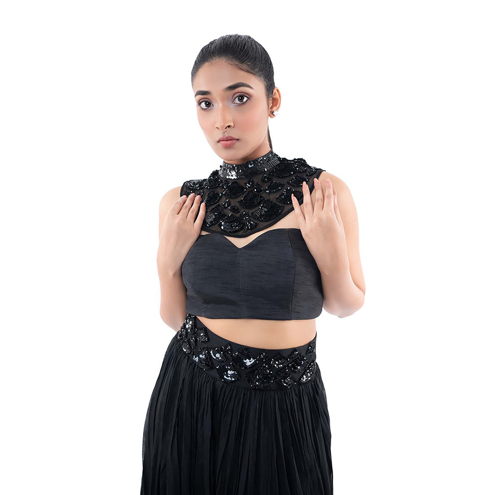 SAYAANIKA Black Noche Bustier with Neck Collar and Palazzo (Set of 3)