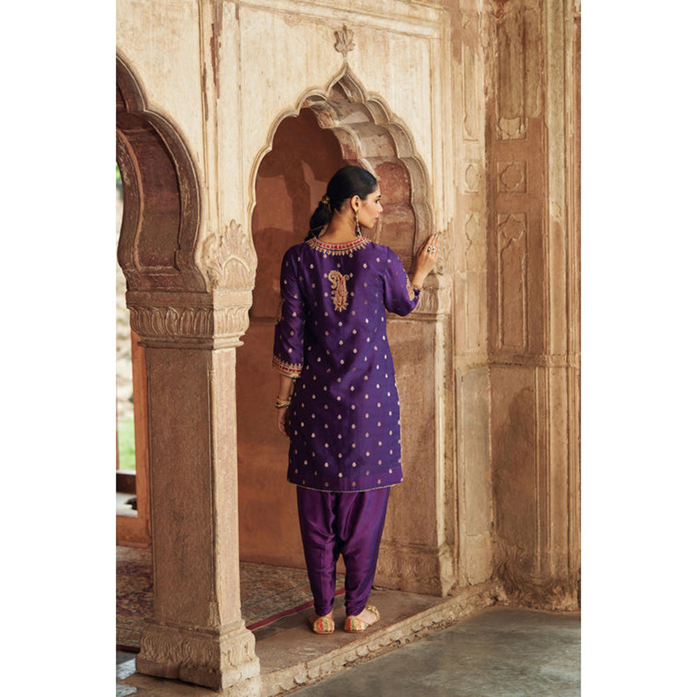 Description : Sheetal Batra Fahmida - Deep Purple Short Kurta With Tulip Pant And Dupatta