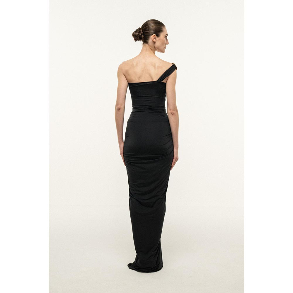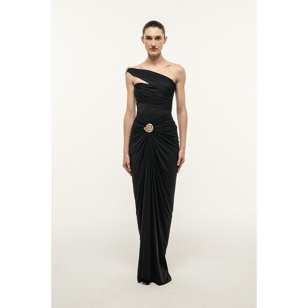 Description : Black fitted maxi dress with an asymmetrical one-shoulder neckline. Smooth bodice construction with soft draping through the skirt, finished with a gold metal shell accent at the waist and shoulder.