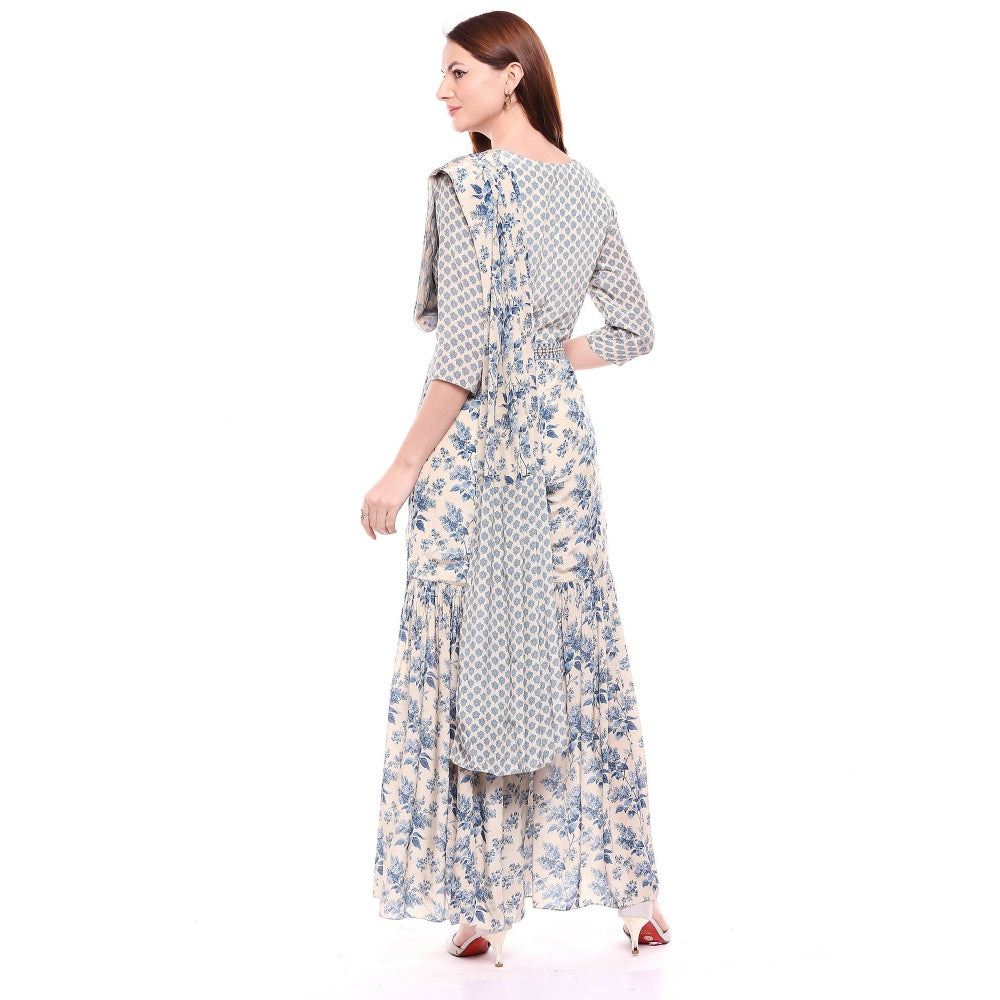 Description : Special occasions deserve elegant ensembles like this classic printed drape sharara dress with attach pallu enhanced with zardozi embroidery. With a classic silhouette and contemporary work, this look will set you apart at the festive gatherings. Pair it up with statement jewellery, a potli bag and peep-toe pumps.