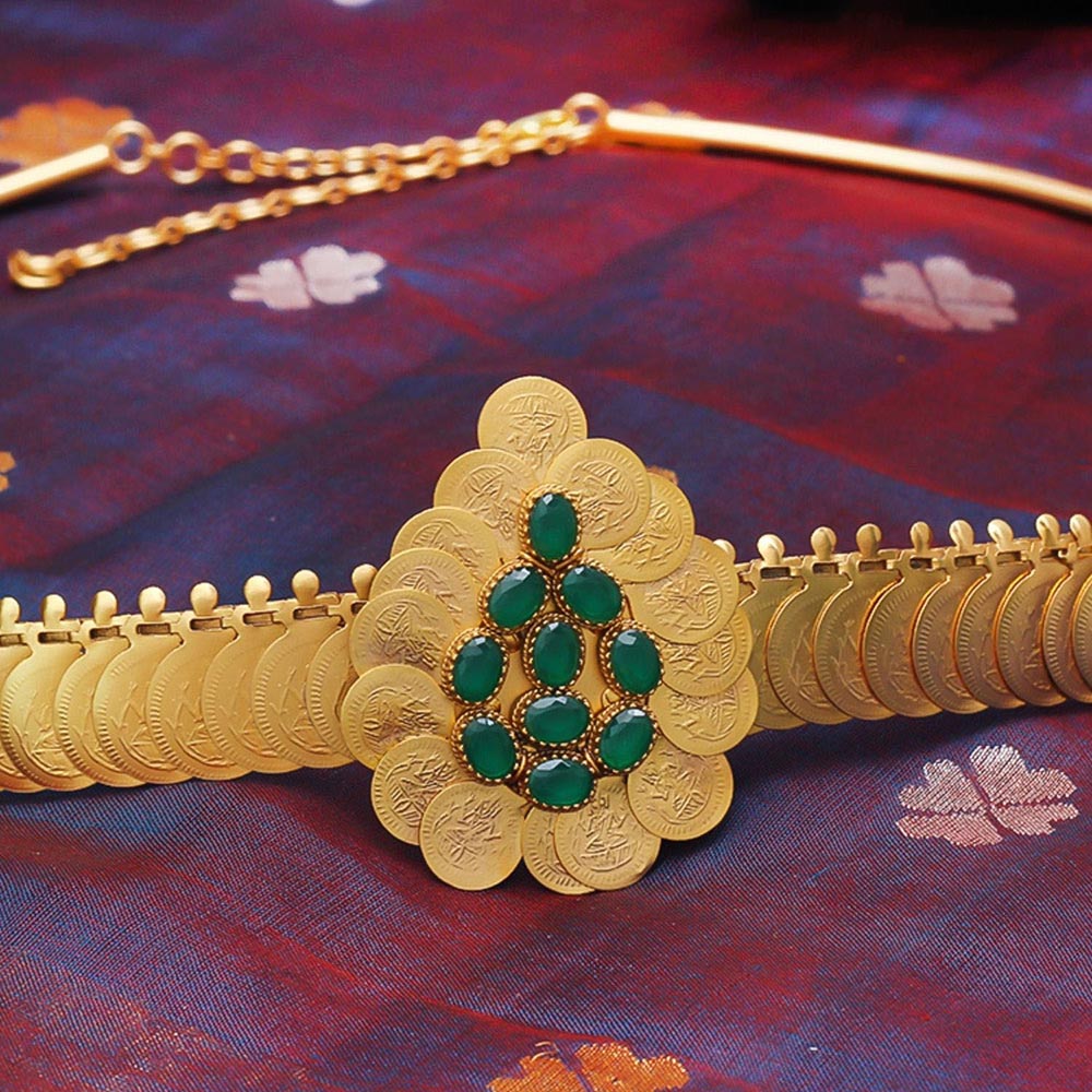 Description : A 22k gold-plated overlay of gold coins holds a gorgeously designed teardrop alignment of lush green stones to accentuate your waist. Wear this with dresses, saris, lehengas, and other clothing. With our handcrafted gold coin belt, experiment and find your own distinctive style. Wear it in your hair, across your arm, anywhere! Adjustable using hoops and clasps.