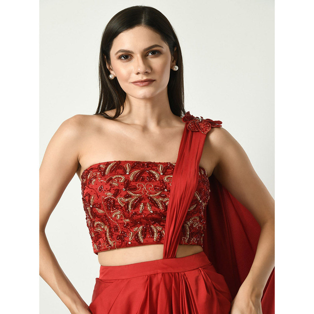 Red Pre-draped Saree with Strapless Corset Sequined with Stitched Blouse