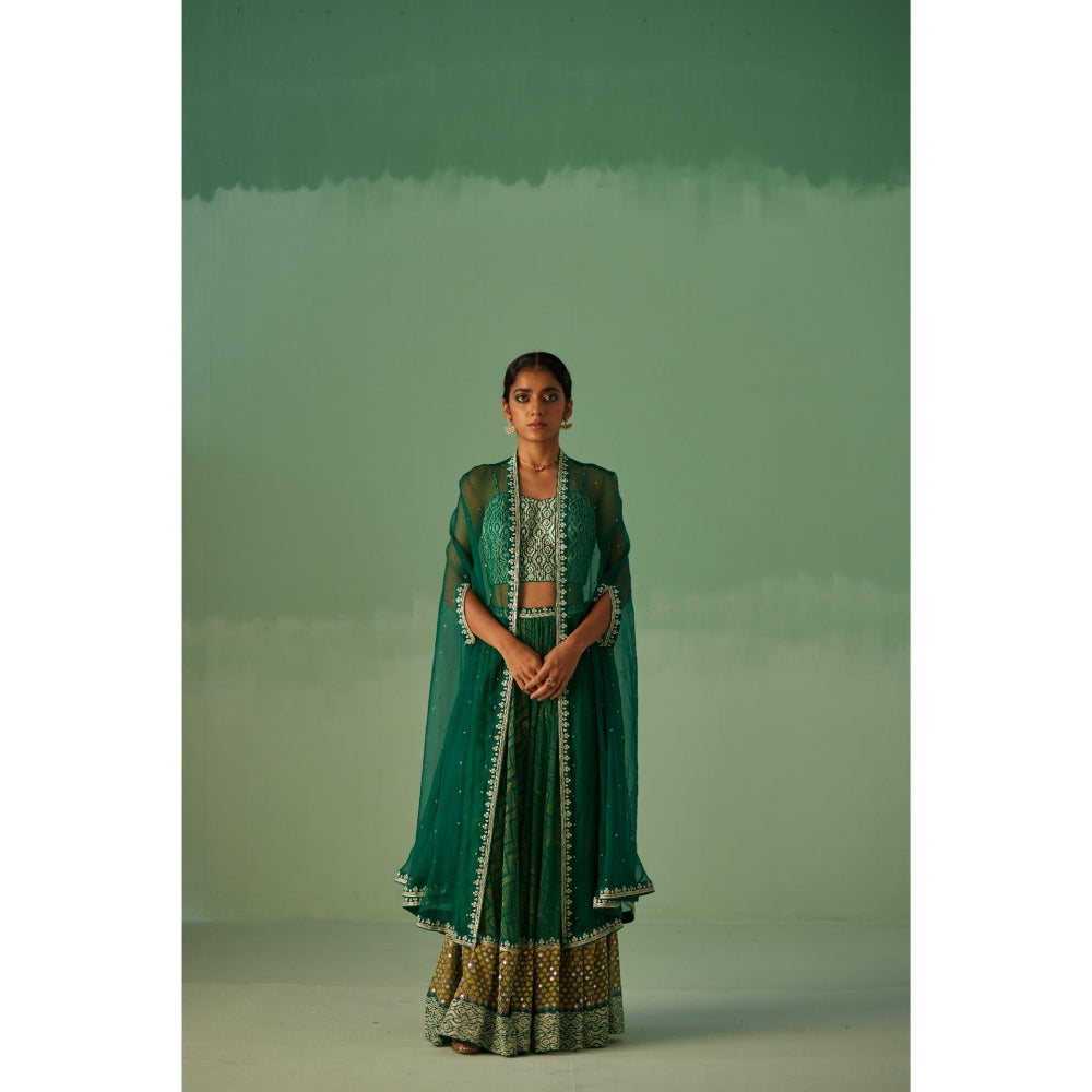 Surbhi Gupta Emerald Green Organza Cape, Blouse and Sharara (Set of 3)