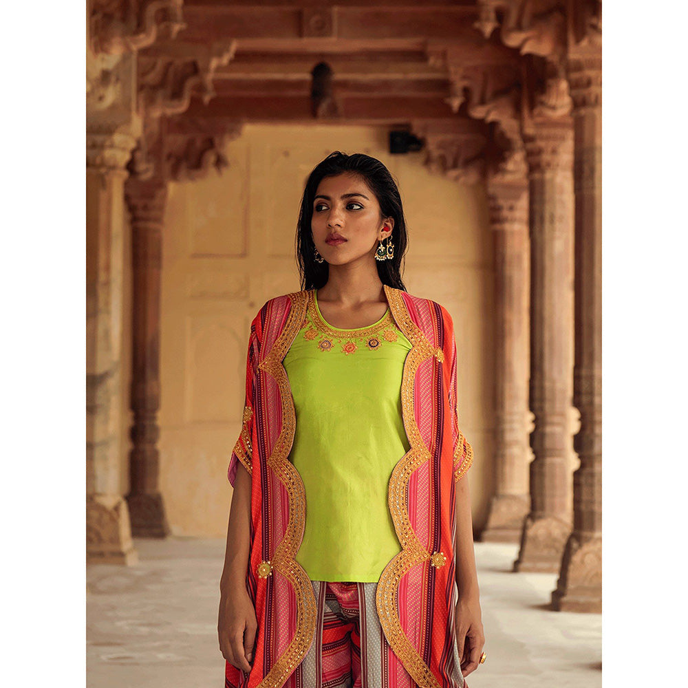 Description : Mela Striped Dhoti Pant With Cape And Top.