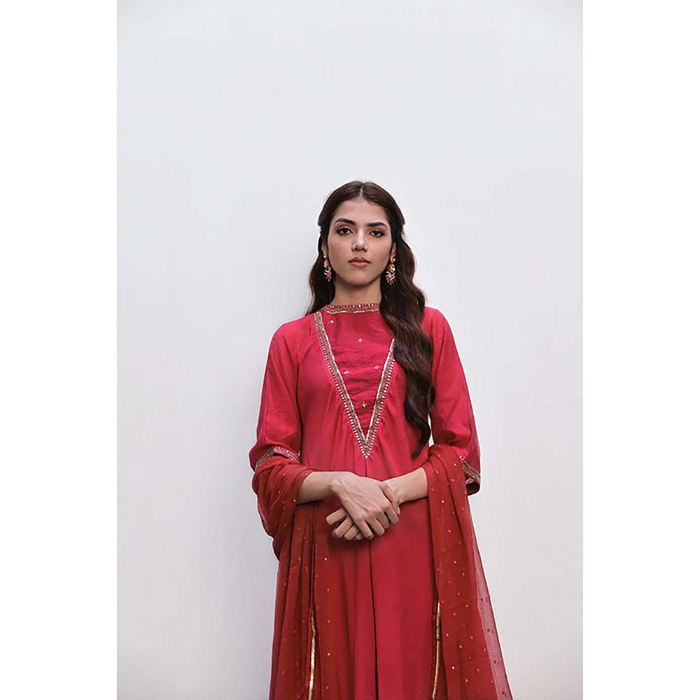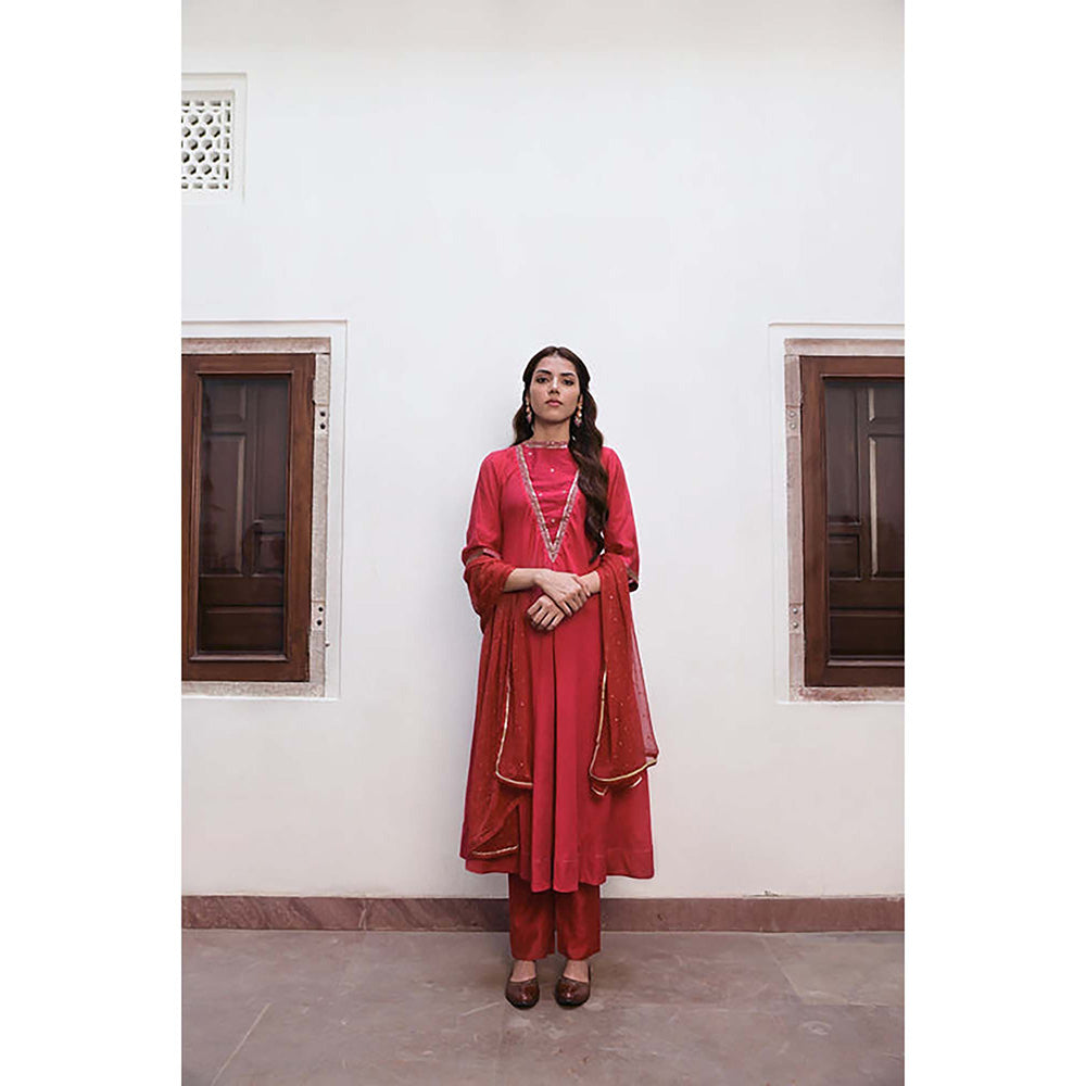 Description : Introducing the 'aabroo' three-fourth sleeve kurta set in a striking red hue. This ensemble is a harmonious blend of tradition and modernity. Crafted from luxurious chanderi silk, it offers both opulence and comfort. The zari and sequin embroidered v- yoke at the front bodice adds a touch of regal elegance. The round neck with zari-sequin embroidery detail enhances the A-line kurta design, creating a graceful and flattering silhouette. Paired with comfortable straight pants, this set combines style and ease effortlessly. The kota silk dupatta with lace detail adds an ethereal touch, making 'aabroo' a timeless choice for those who appreciate the fusion of tradition and contemporary charm.