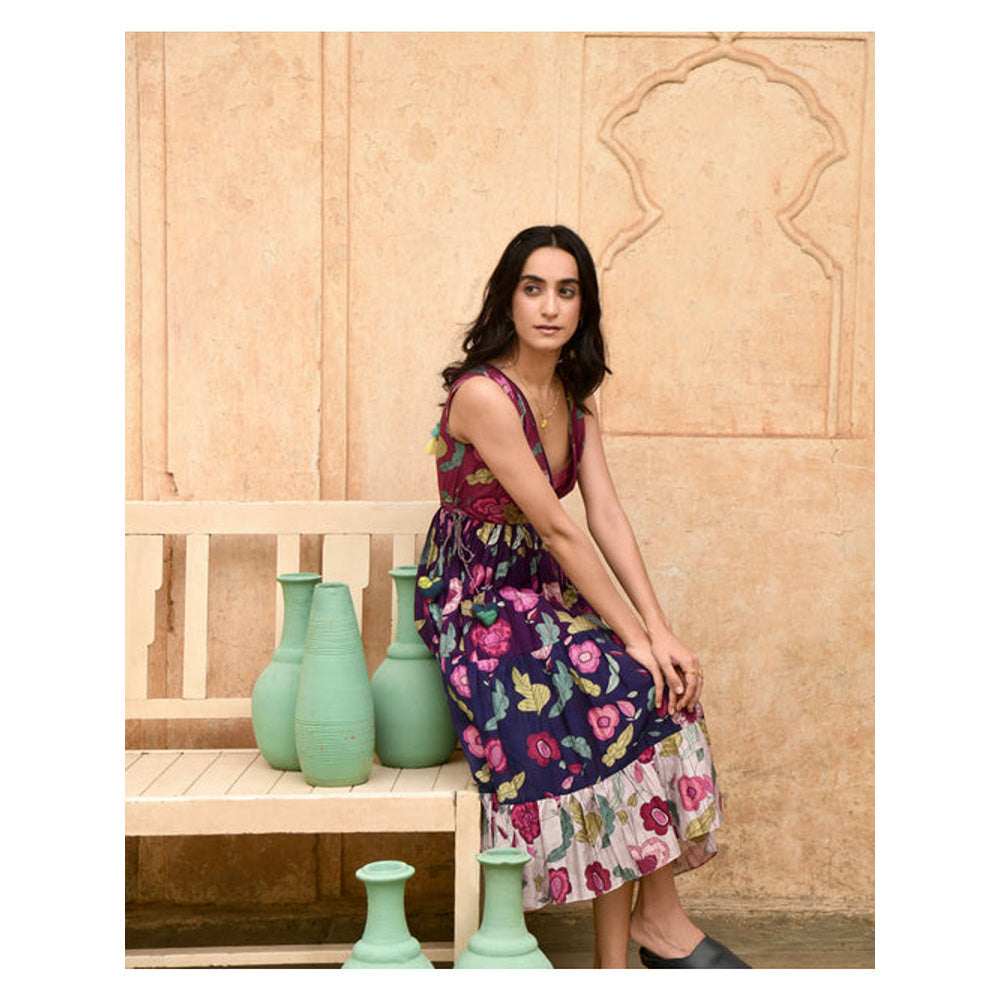 Description : Our floral dream dress in flamboyant hues and multi coloured tiers float like a dream. Tailored in our mesmerizing foliage print of chanderi silk, this sleeveless dress with overlap v-neck and floaty skirt pour its timeless charm to your next day outing. It features beautifully handcrafted tassels on sides and it comes with a chanderi slip.