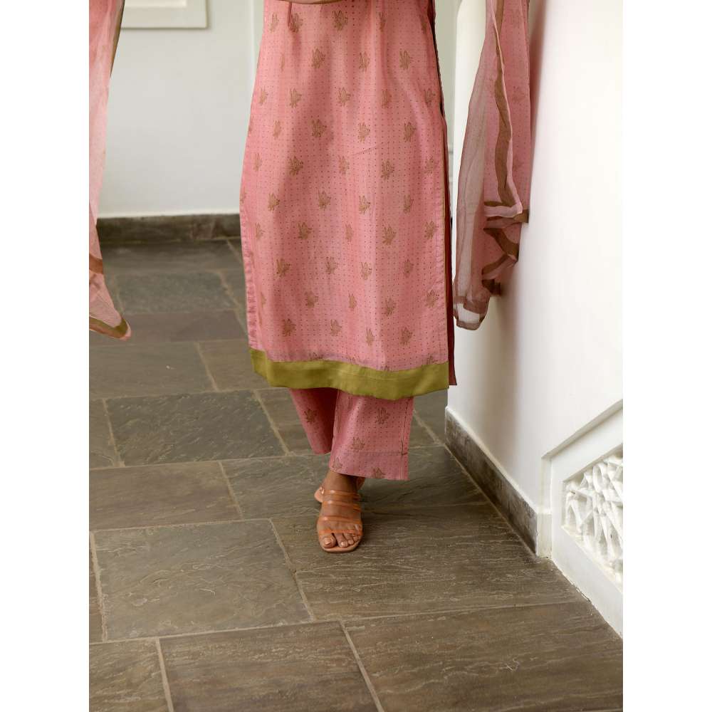 Description : This kurta set has cinnamonand polka print in shades of olive on the bed ofsalmon pink. Made of hand woven chanderi silkwith a sharp v neckline & high side slits on theside and a olive green border at the bottom,comes with a chiffon dupatta.
