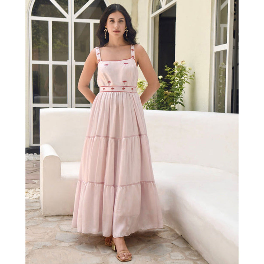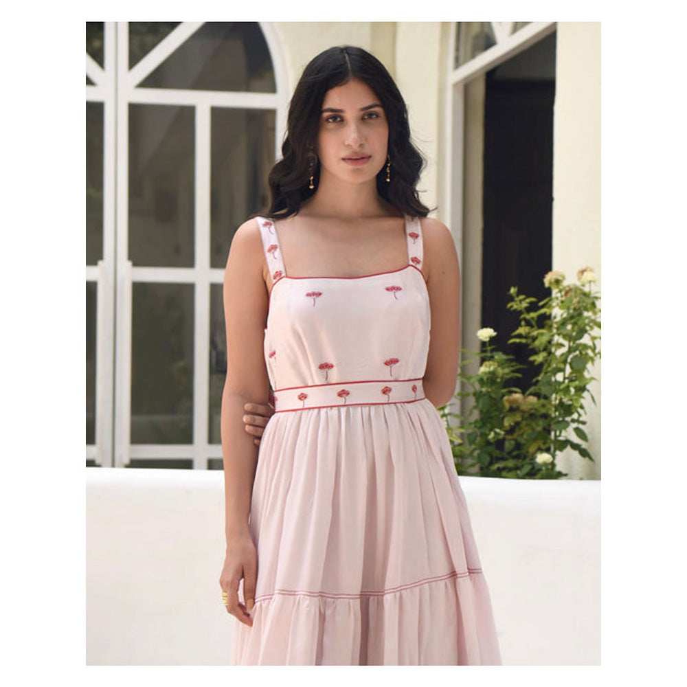 Description : Rosewater pink dress is a three-tiered strappy dress, adorned with intricate hand embroidered lotus flowers patched on the bodice and straps. With soothing hue and minimal details, this maxi dress makes for an effortless going-out pick. Tailored in modal satin fabric and comes with an embroidered belt.
