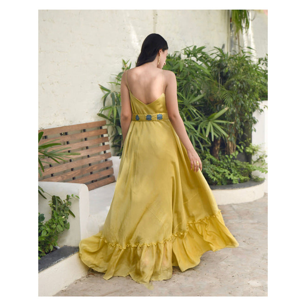 Description : It's a happy beach yellow dress made in modal silk fabric. It's a bias cut strap dress with gathered panel at the bottom and pockets on each side with a waist belt to style up the dress. Intricate and applique lotus embroidery has been done on the belt in blue over yellow color.