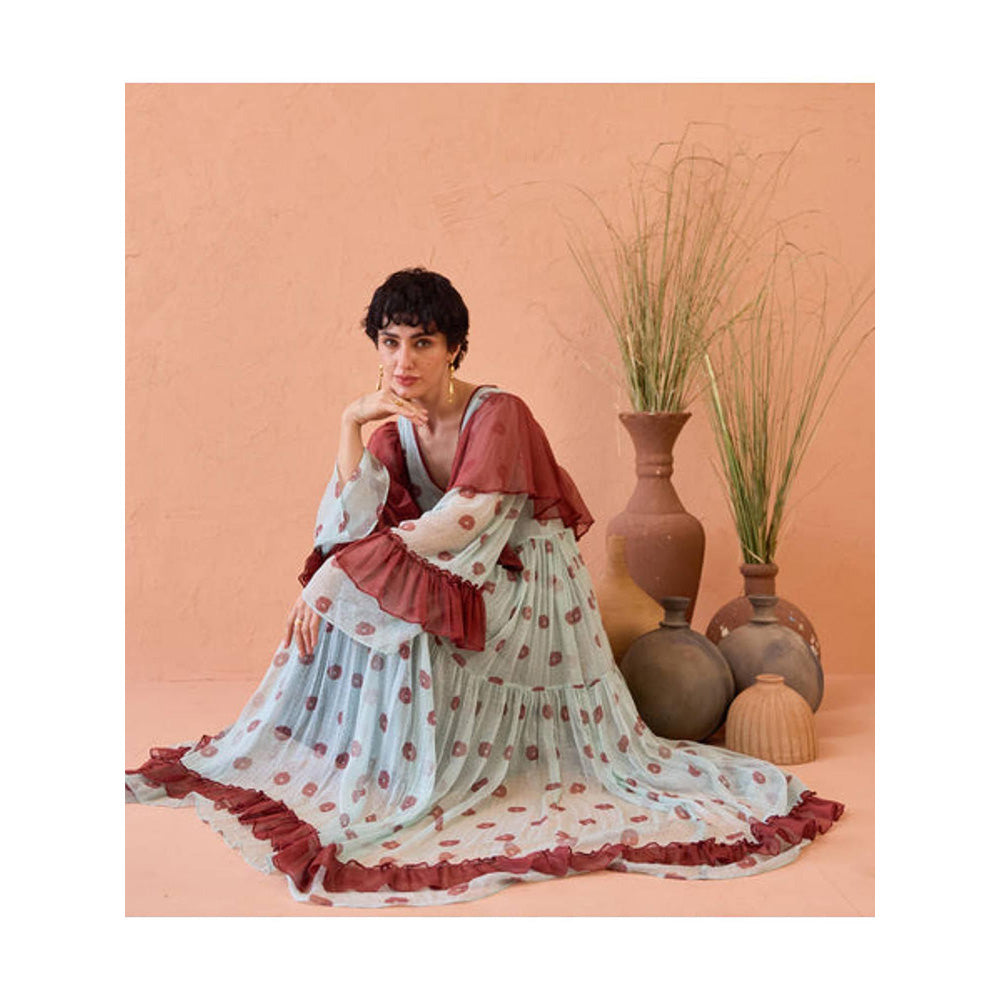 Description : The Wildflower Ruffles Dress is a light and flowy tiered maxi crafted in soft mint green chiffon, adorned with playful hand-blocked maroon floral motifs and polka dots. Designed with a flattering V-neckline and layered bell sleeves, it features contrast ruffles in rich maroon on the sleeves and hemline for a soft, romantic finish. Perfect for sunlit days and warm evenings, this dress captures an easy, bohemian spirit with a refined touch.