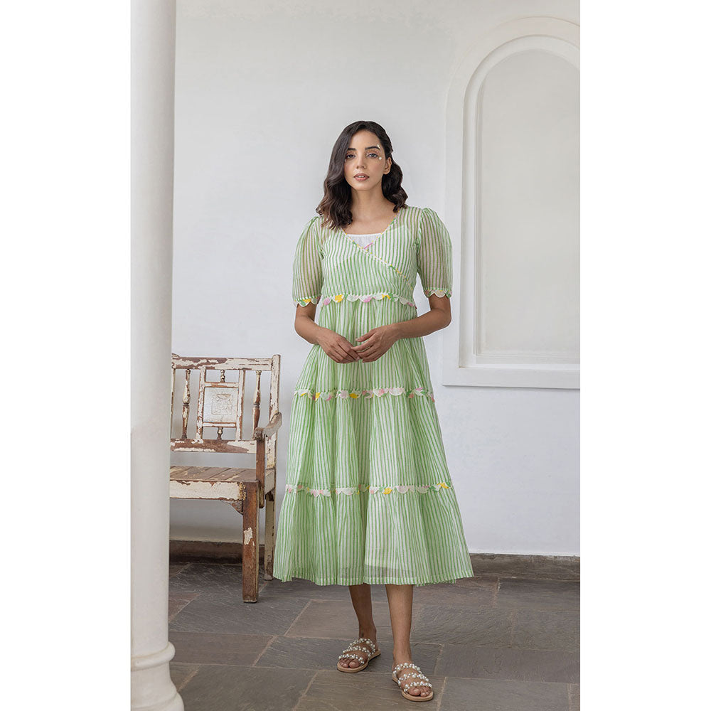 Description : Freshen up your wardrobe with this green maxi tier dress (set of 2) from The Yellow Bow. Tailored from chanderi in a comfortable fit, it is finished with half sleeves and a v-neck. Team this set with a pair of heels and dainty jewellery to complete the look.
