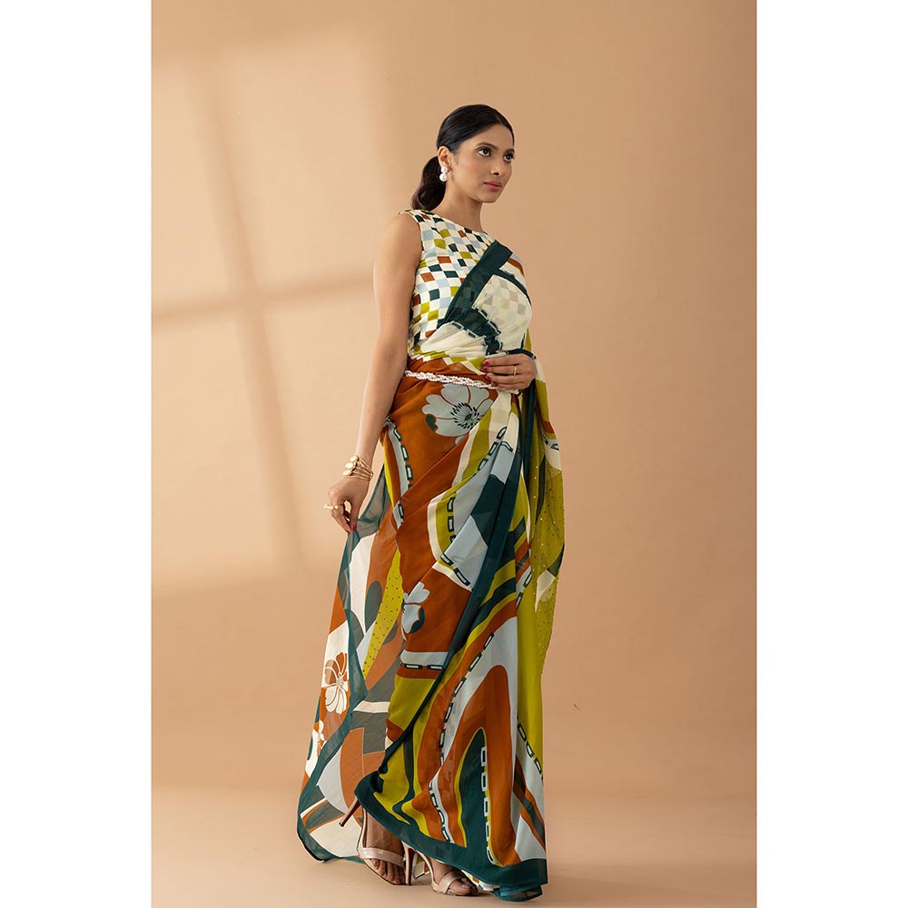 Thee Modern Roots Light Olive Printed and Embellished Georgette Saree with Unstitched Blouse