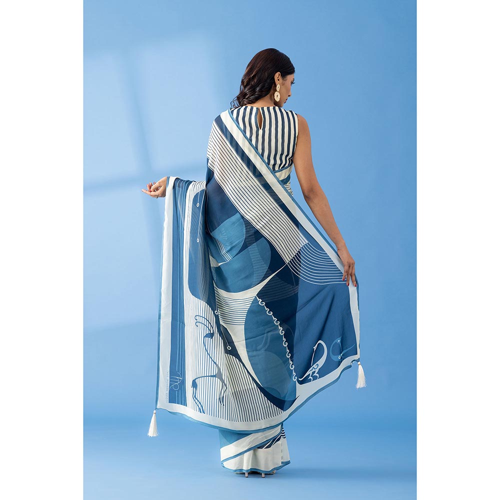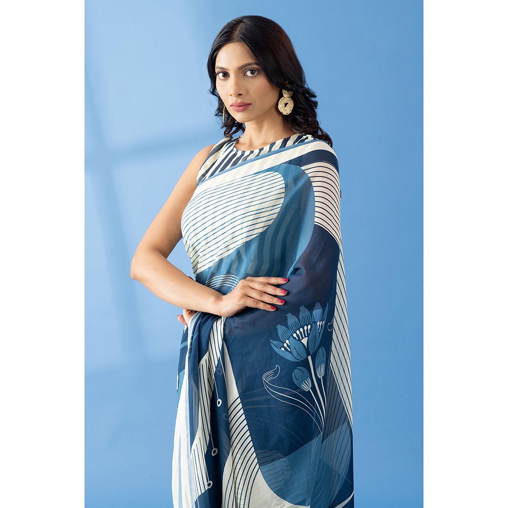 Thee Modern Roots Slate Blue Abstract Printed Georgette Saree with Unstitched Blouse