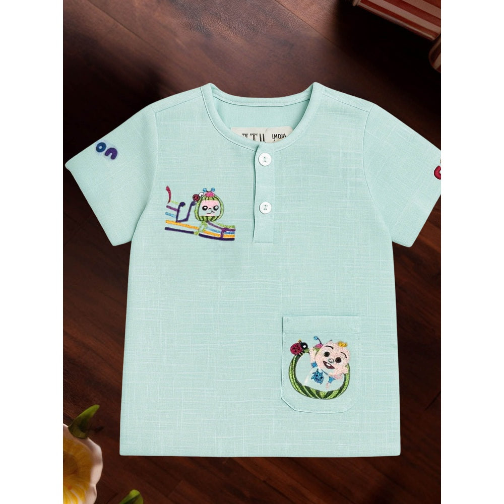 Description : This pastel mint green shirt features playful Coco melon-inspired embroidery, with colorful motifs of characters on the chest and pocket. The soft cotton fabric and cheerful sleeve lettering make it perfect for everyday fun and comfort.