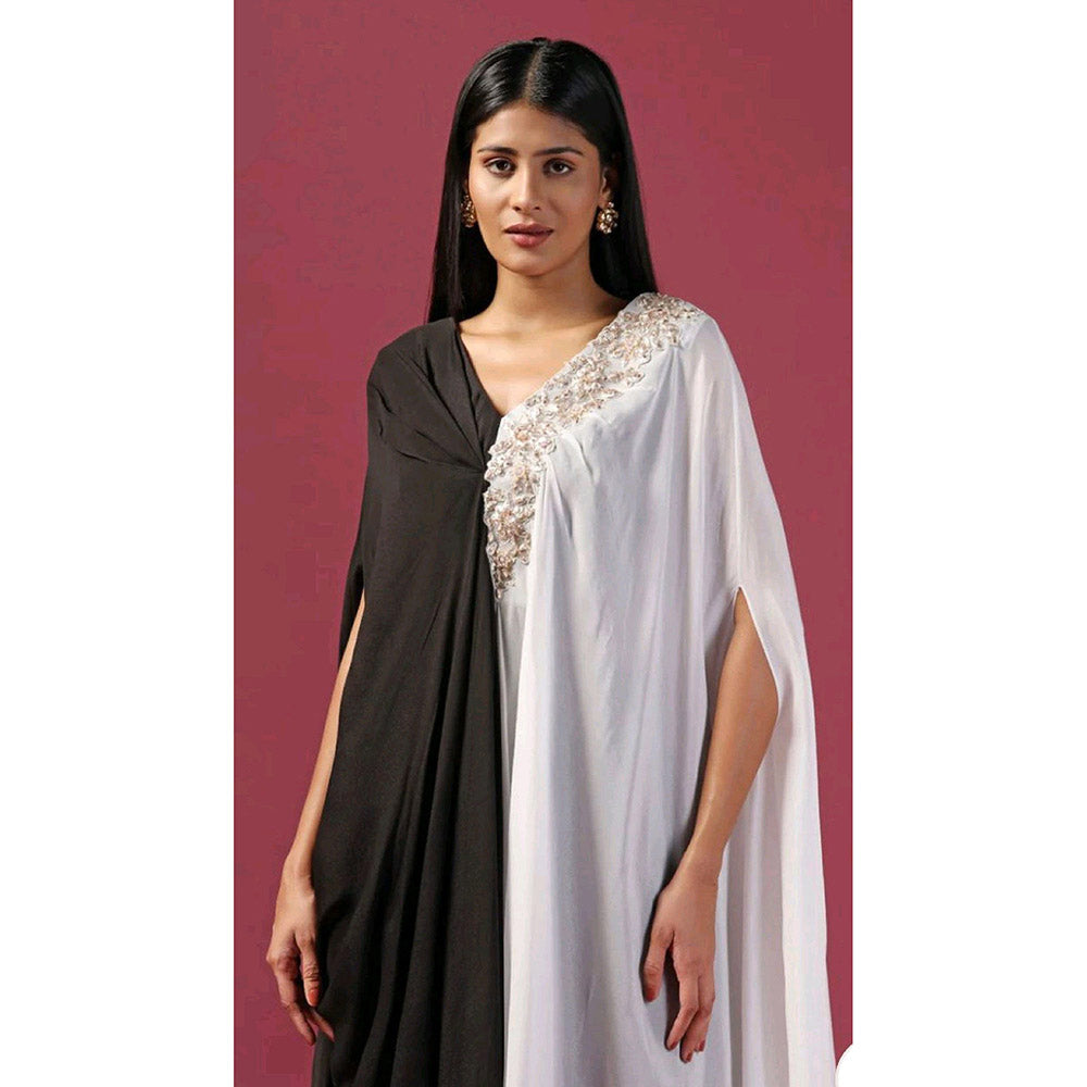 Description : Introducing Our Striking Black Kaftan Set, Crafted From Luxurious Georgette Fabric. The Kaftan Features Sequins and Antique Gold Pitta Dabka Motif On One Side Of The Neckline, Adding A Touch Of Glamour. The Other Side Boasts A Striking Half-and-Half Design, with One Half In Black and The Other In White. Paired with Black Pants, This Ensemble Offers A Chic and Sophisticated Look For Any Occasion.