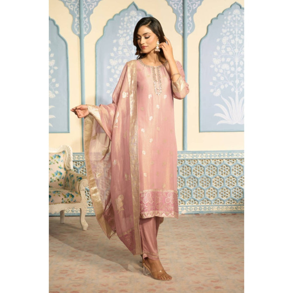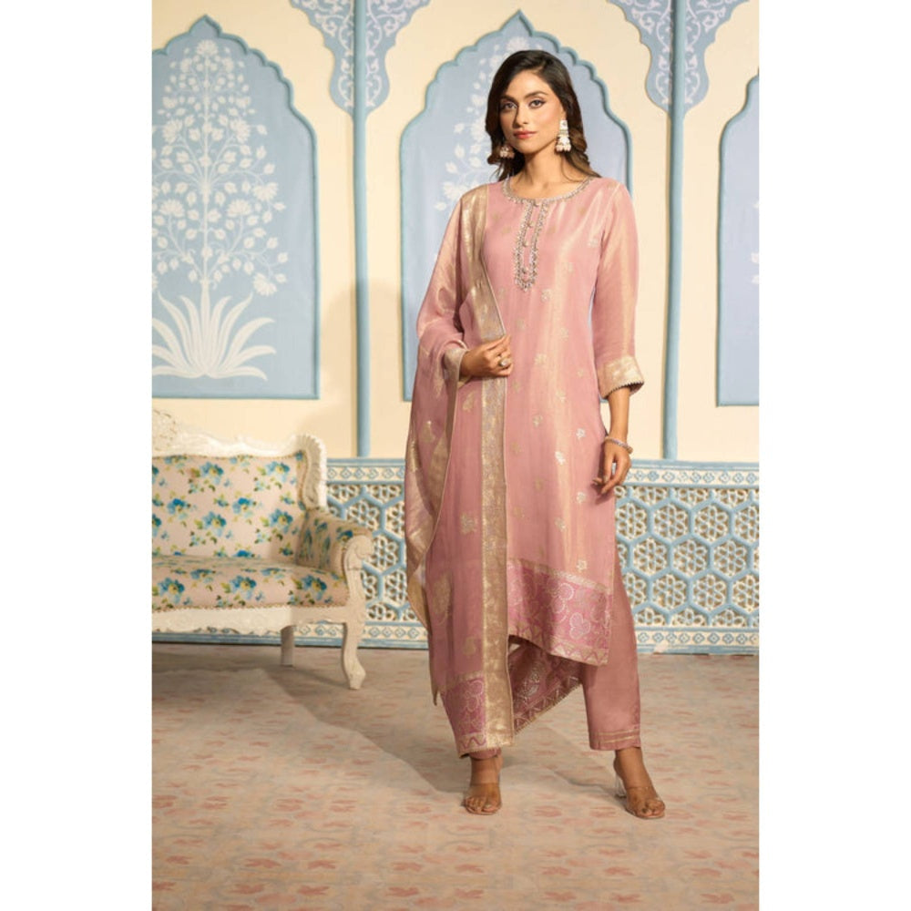 Embroidered Pink Banarasi Kurta Set With Gold Embroidery
