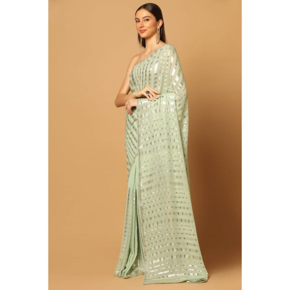 Indulge in the opulent charm of this mint green georgette saree adorned with shimmering zigzag sequins and vertical lines. The accompanying unstitched blouse boasts a striking check pattern in a luminous gold hue, covering every inch with elegance and allure.